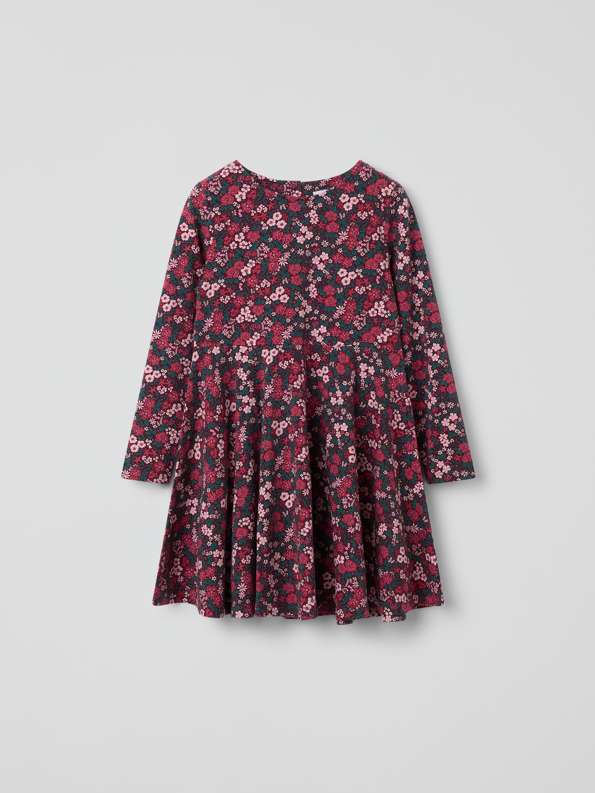 Vår klassiske snurrekjole er et «must» i barnegarderoben! Den er fremstilt i myk økologisk bomullstrikot og har ekstra vidde i skjørtedelen, som står fint ut når man snurrer rundt. Kjolen lukkes med knapper bak på ryggen.