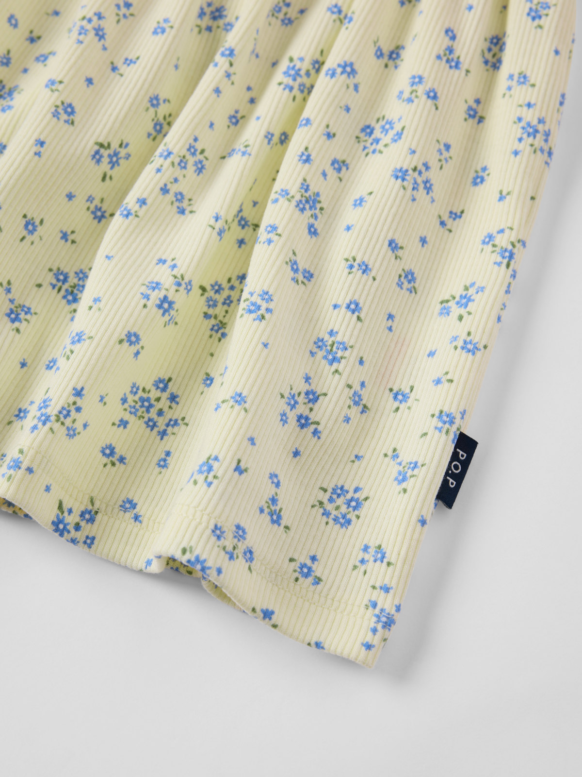 Søt kjole i myk, økologisk bomullsjersey. Kjolen har heldekkende små blomster og fine volanger over skuldrene.