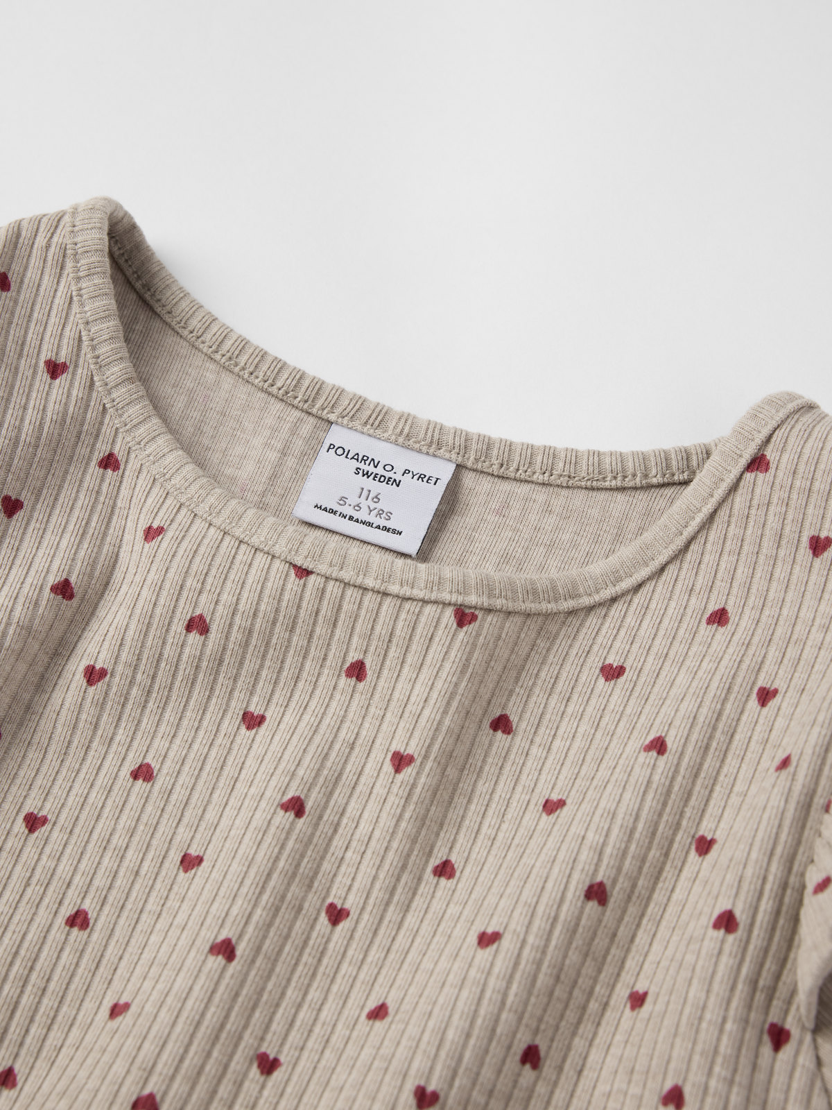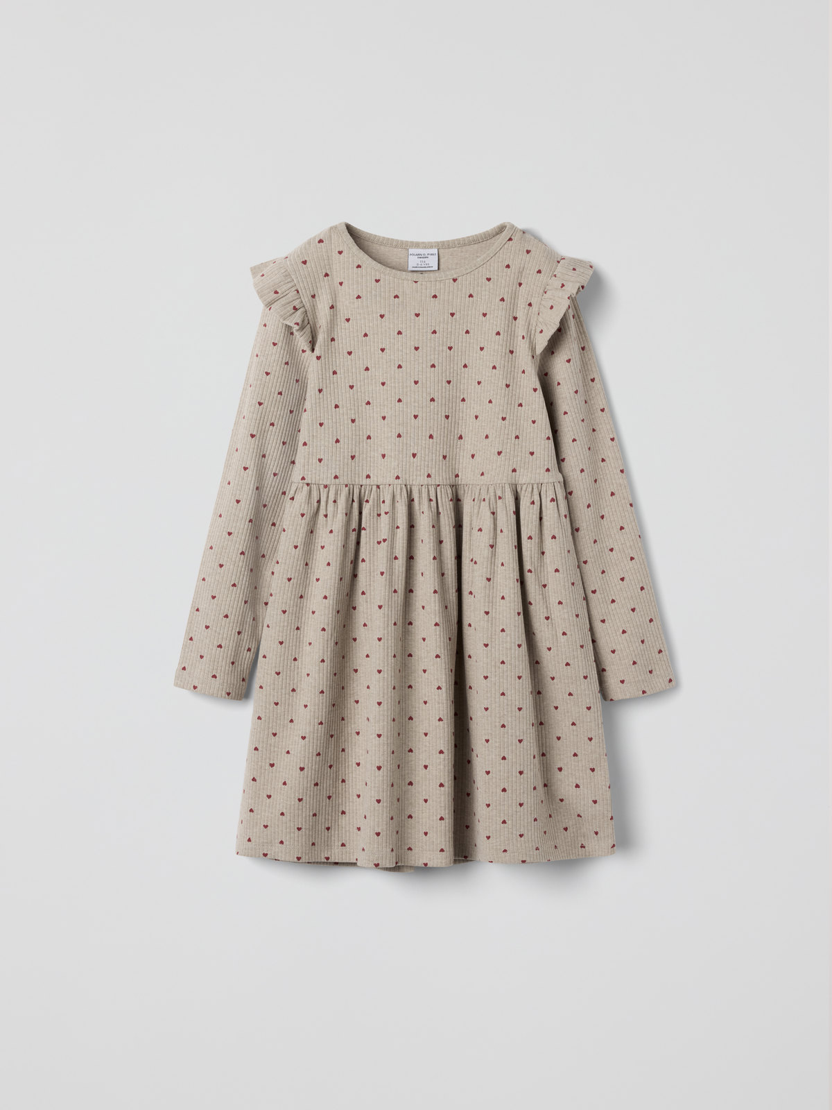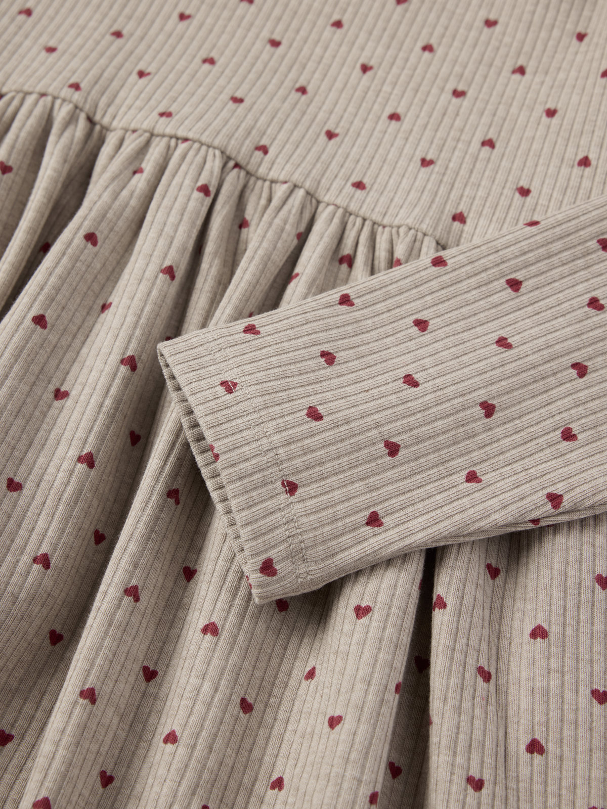 Myk, ribbestrikket kjole i økologisk bomull for baby. Kjolen er helprintet med små hjerter og pyntet med små volanger over skuldrene.