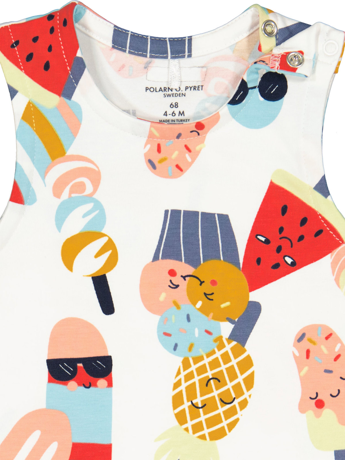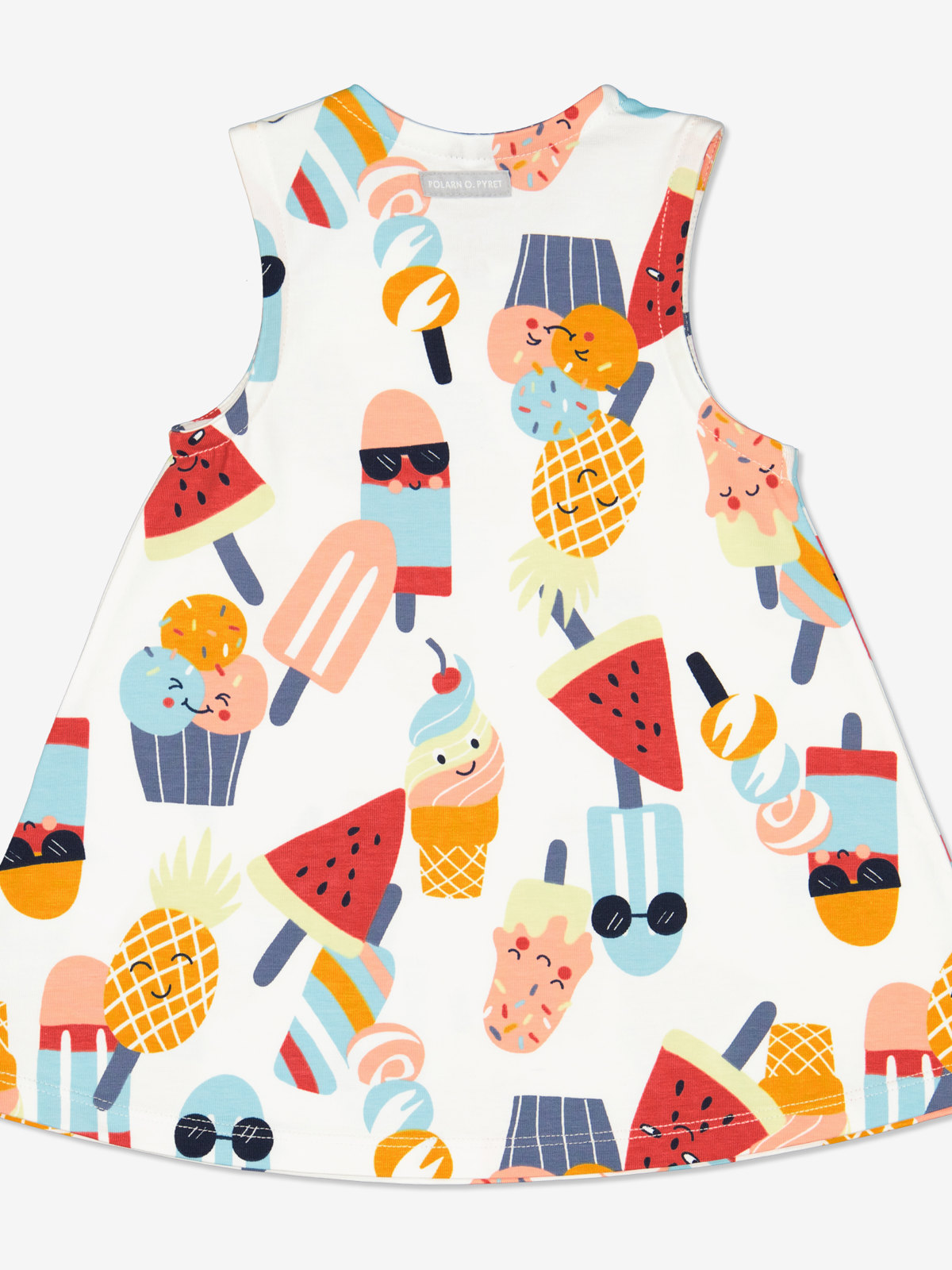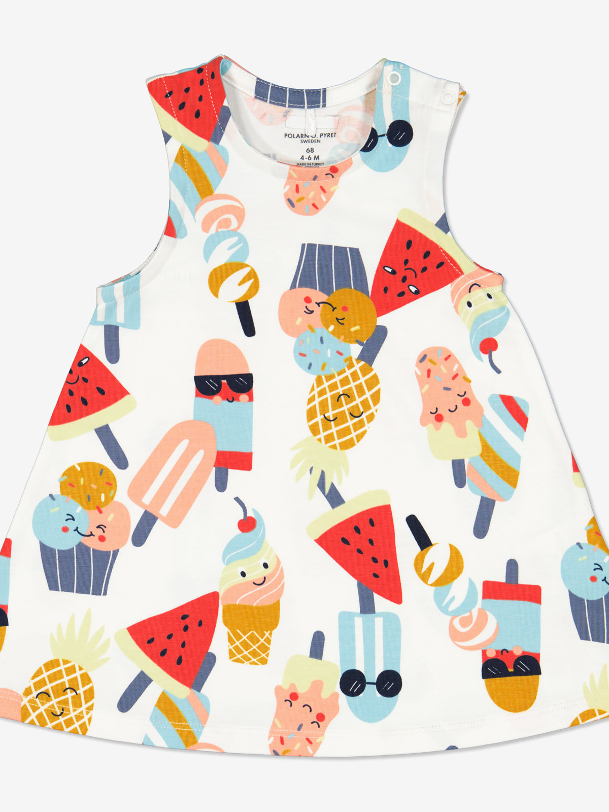 En nydelig kjole til de aller minste, i myk økologisk bomull. Kjolen er helmønstret med et herlig iskremtrykk og passer perfekt til hverdags eller til festlige anledninger! Trykknappene på den ene skulderen gir enklere klesskift. Størrelsene 50–62 har trykknapper på begge skuldrene.