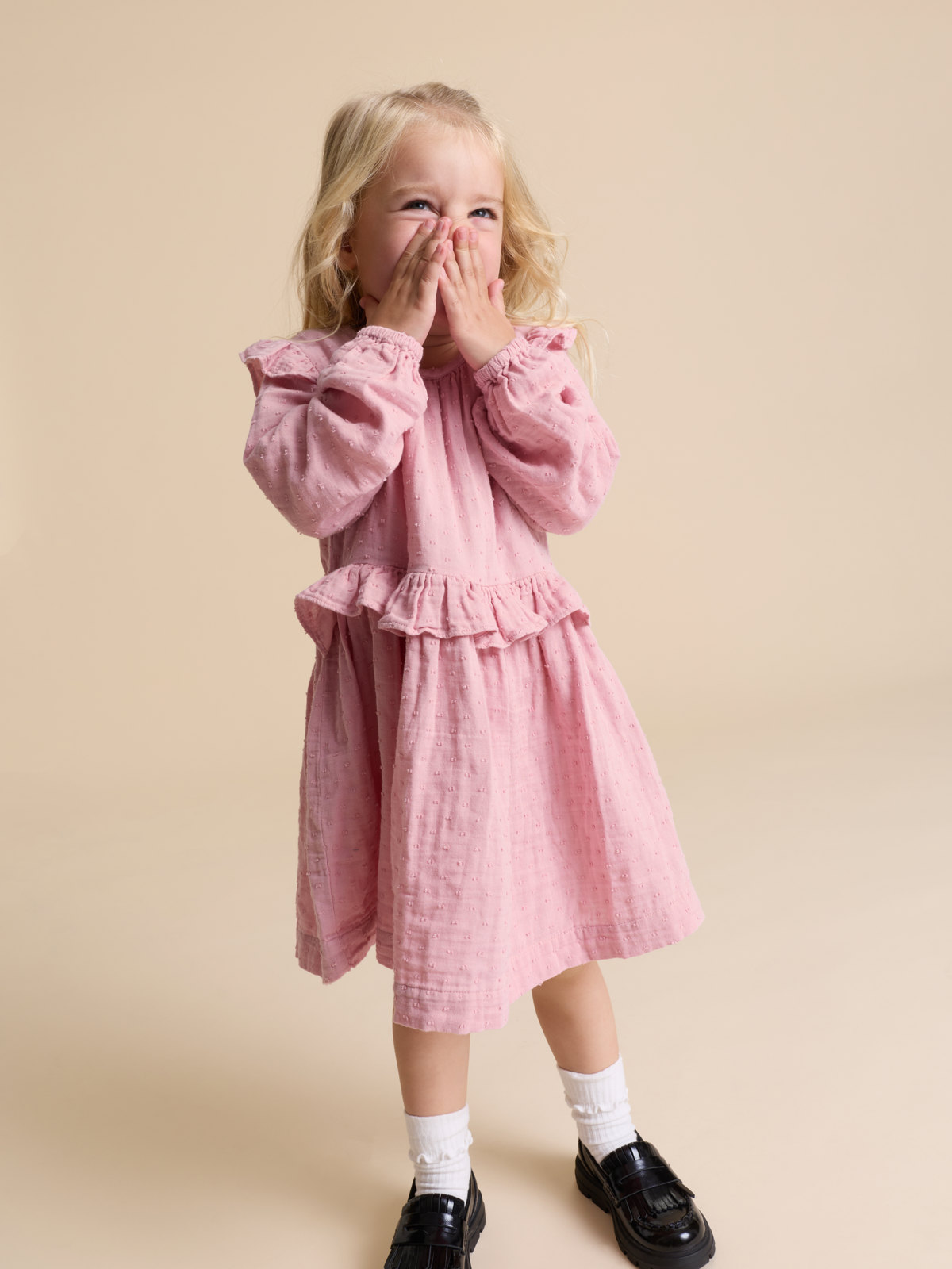 Søt musselinkjole i 100 % økologisk bomull – perfekt for alle anledninger! Kjolen har volanger i midjen og over skuldrene, og lukkes med knappestolpe bak. Ermene har strikk i nederkant.