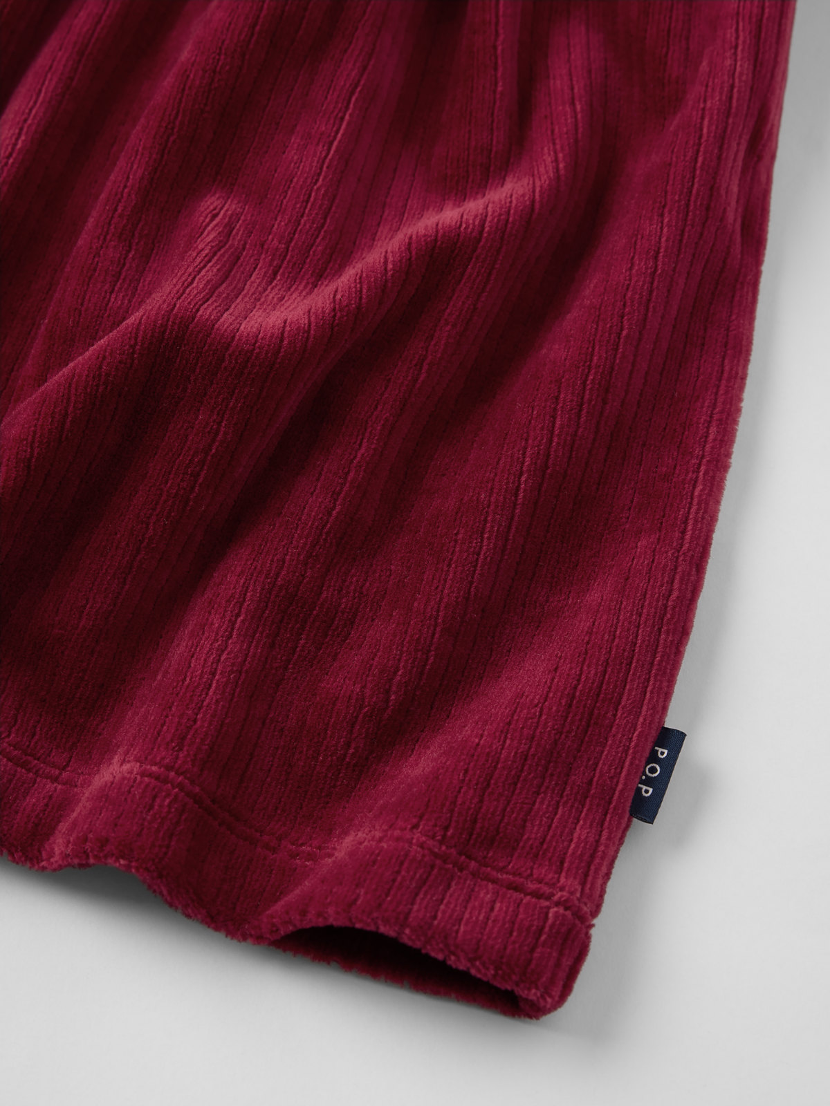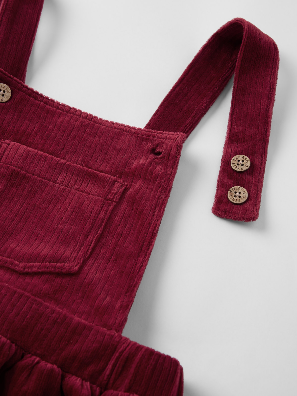 Forklekjole i myk kordfløyelsjersey av 100 % økologisk bomull – fin til både hverdag og fest! Kjolen har smale seler som lukkes med knapp foran, markert midje og rynket skjørtedel. Den har også en dekorativ brystlomme.