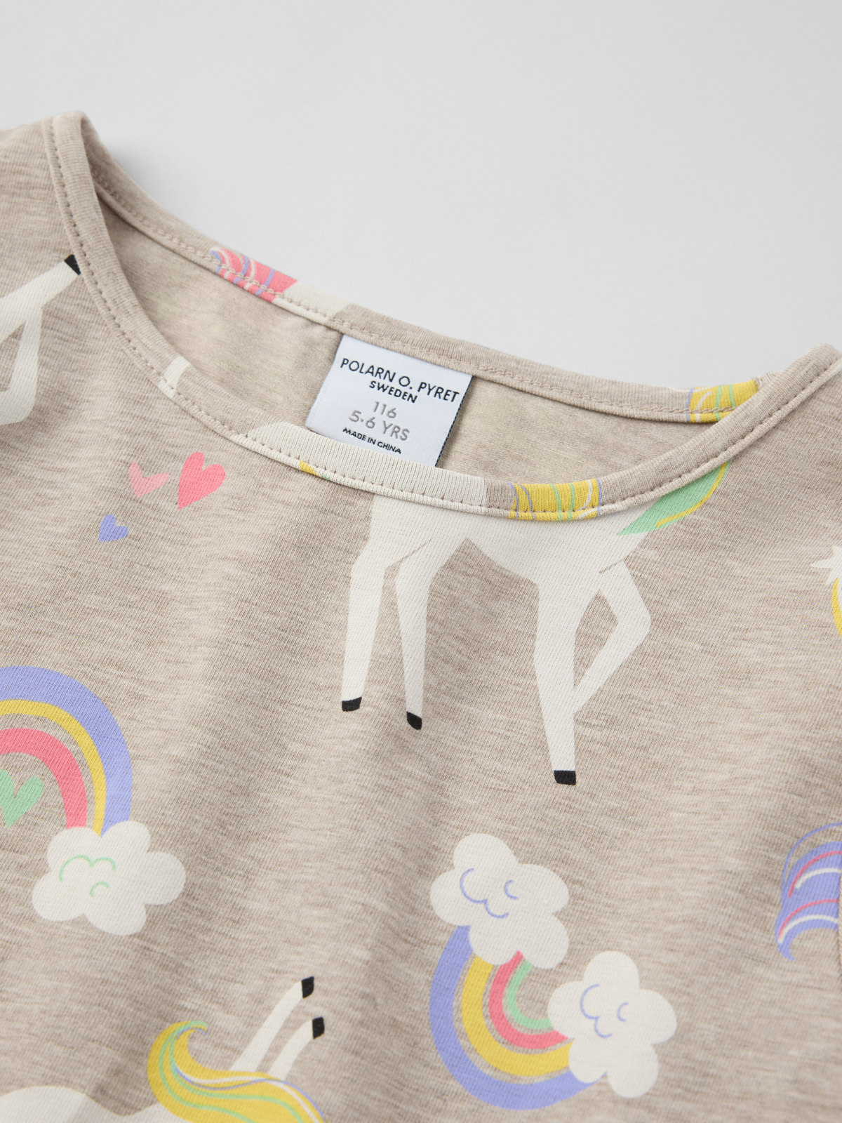 Fin hverdagskjole med vidt skjørt – perfekt til både vardag og fest! Kjolen er laget i myk, økologisk bomull og har ribbestrikket kant i halsen. Den lukkes med knapper bak på ryggen.
