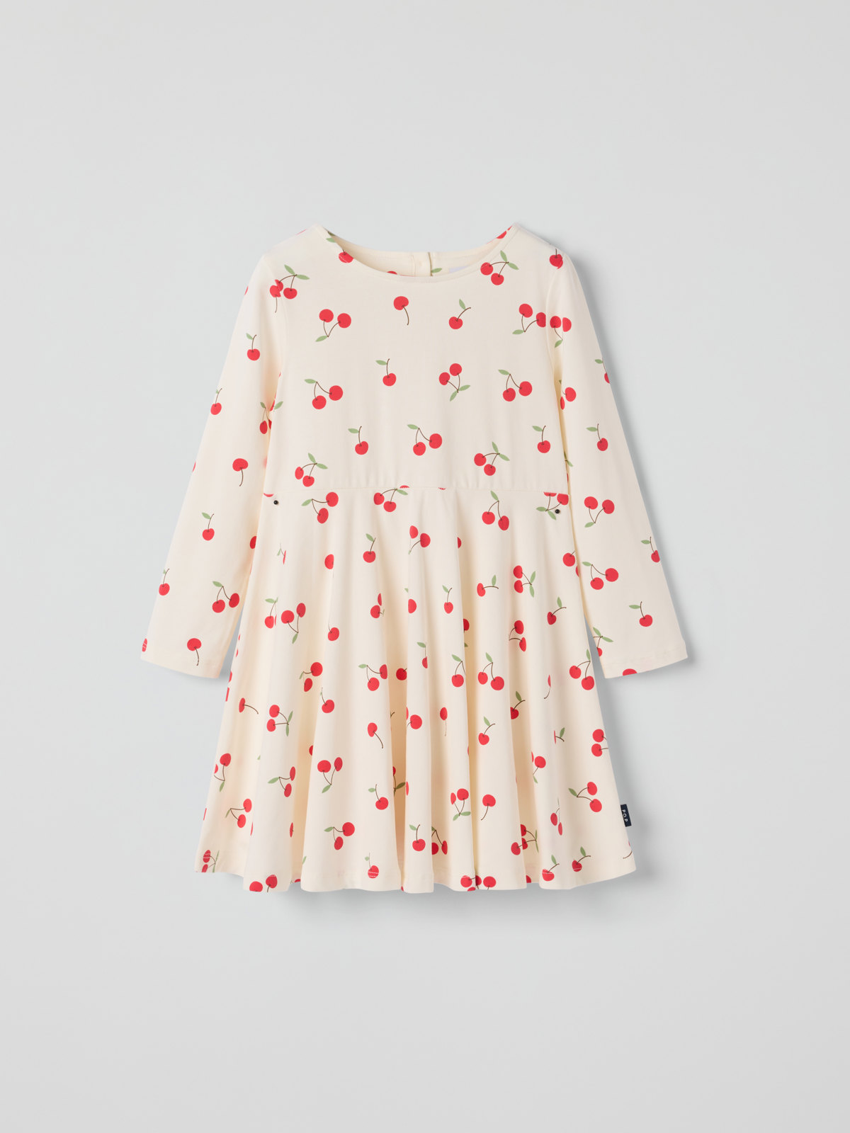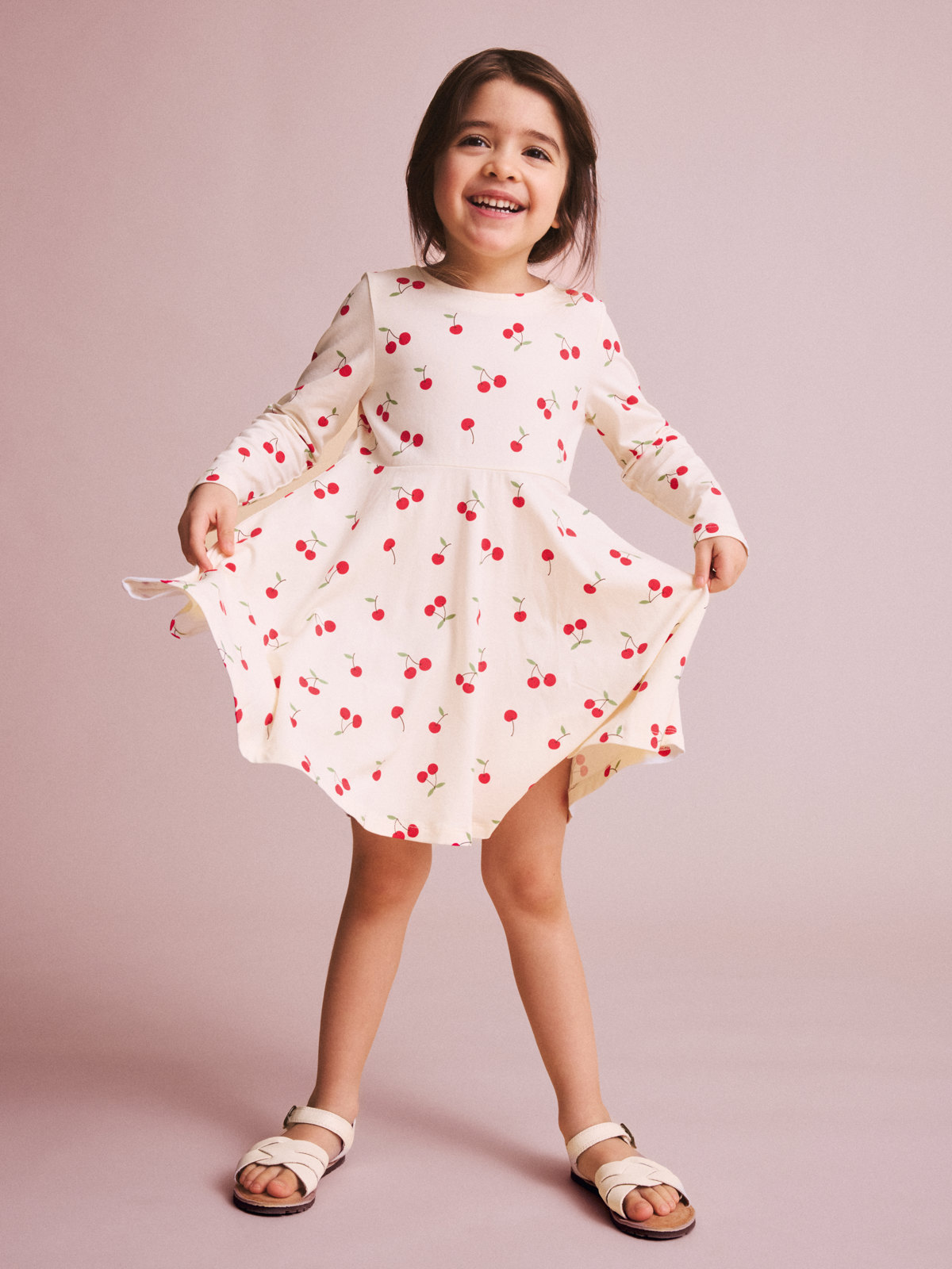 Denne kjolen er et must i barnegarderoben! Den er laget i myk, økologisk bomullsjersey og har ekstra vidde i skjørtet som svinger flott når man snurrer rundt. Kjolen lukkes med knapper bak på ryggen.