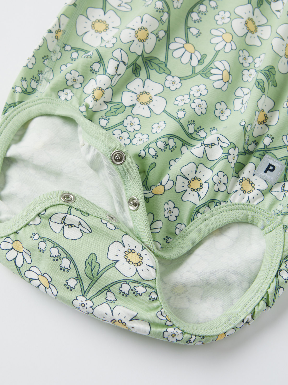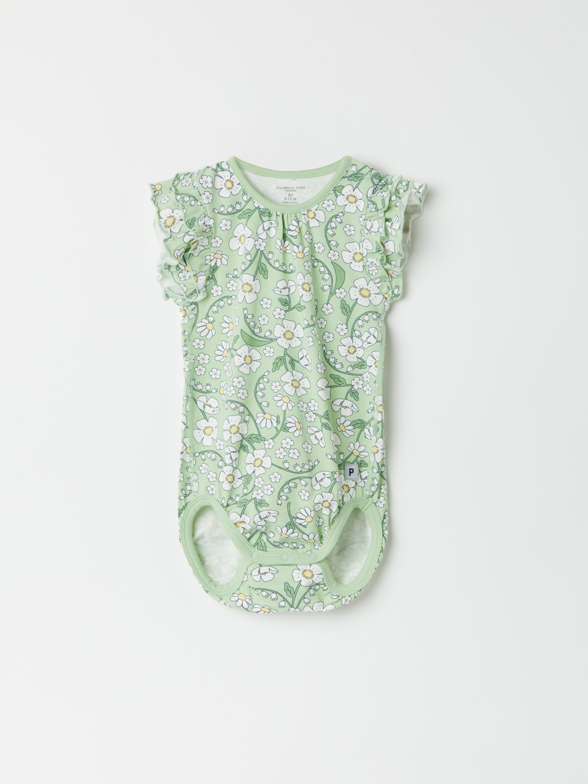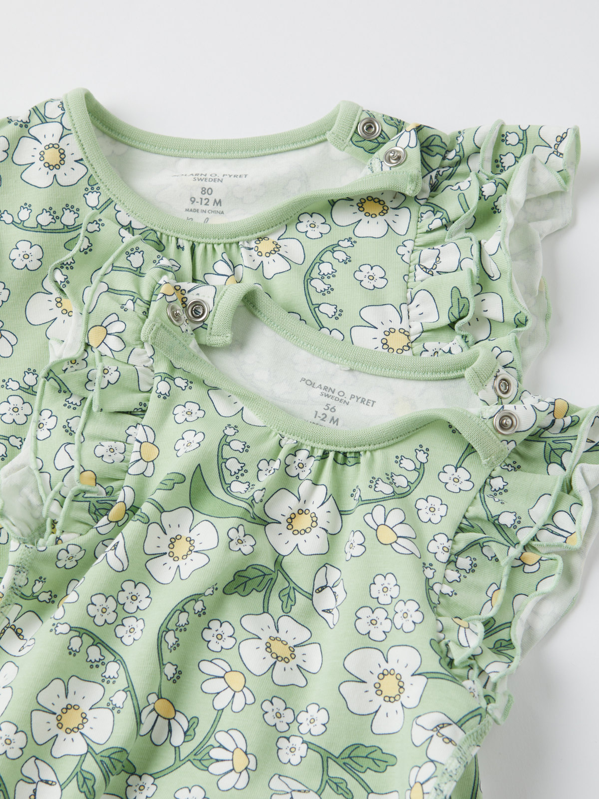 Søt body i myk økologisk bomull til baby. Bodyen er helmønstret med blomster og har doble volangermer.