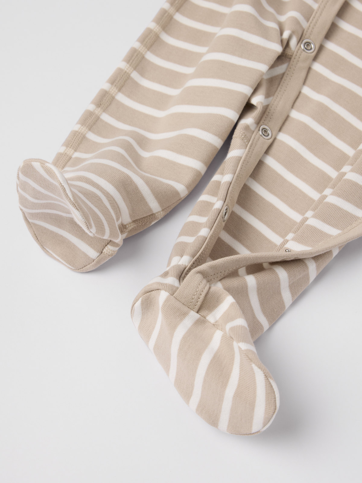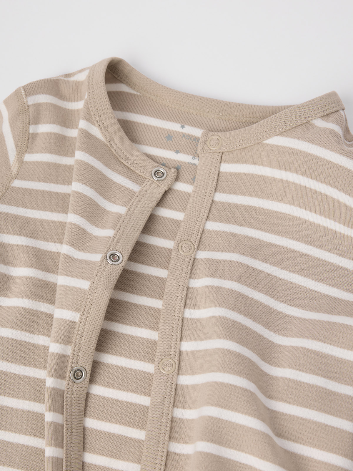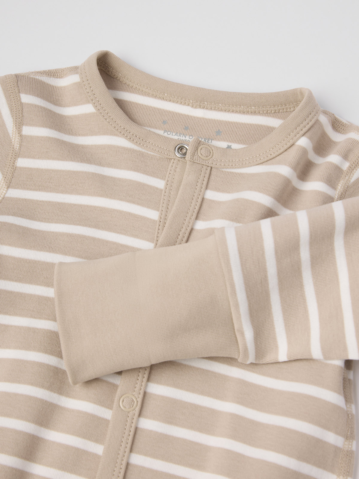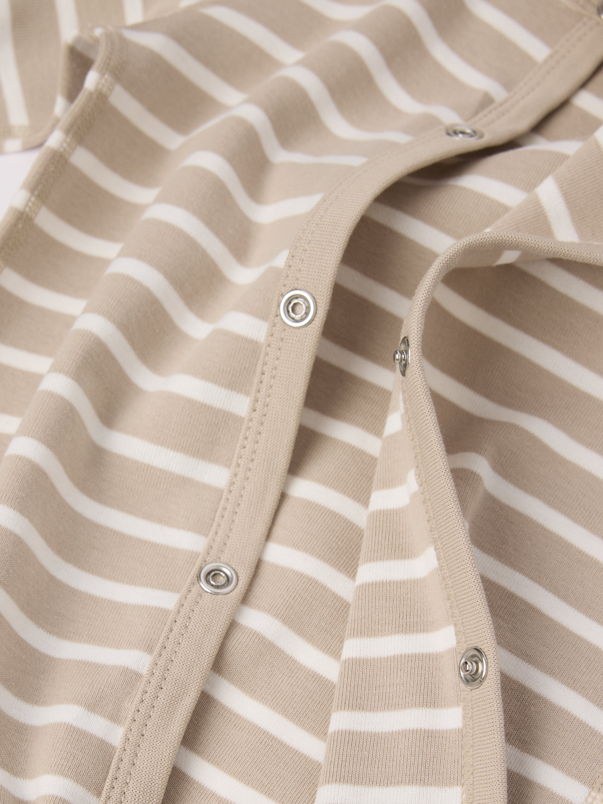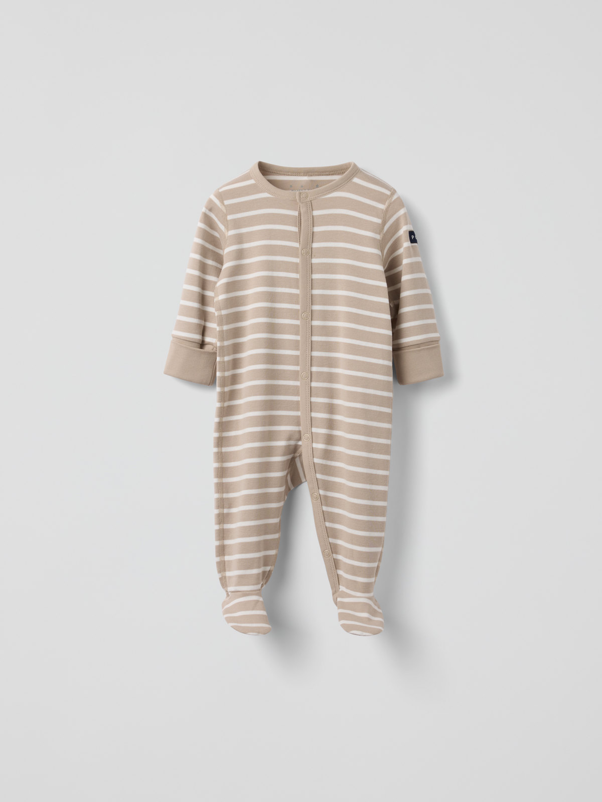 Stripete pysjamasoverall i myk økologisk bomull til de aller minste. Vrangborden nederst på ermene og bena er ekstra lang og kan brettes ned etter hvert som barnet vokser.