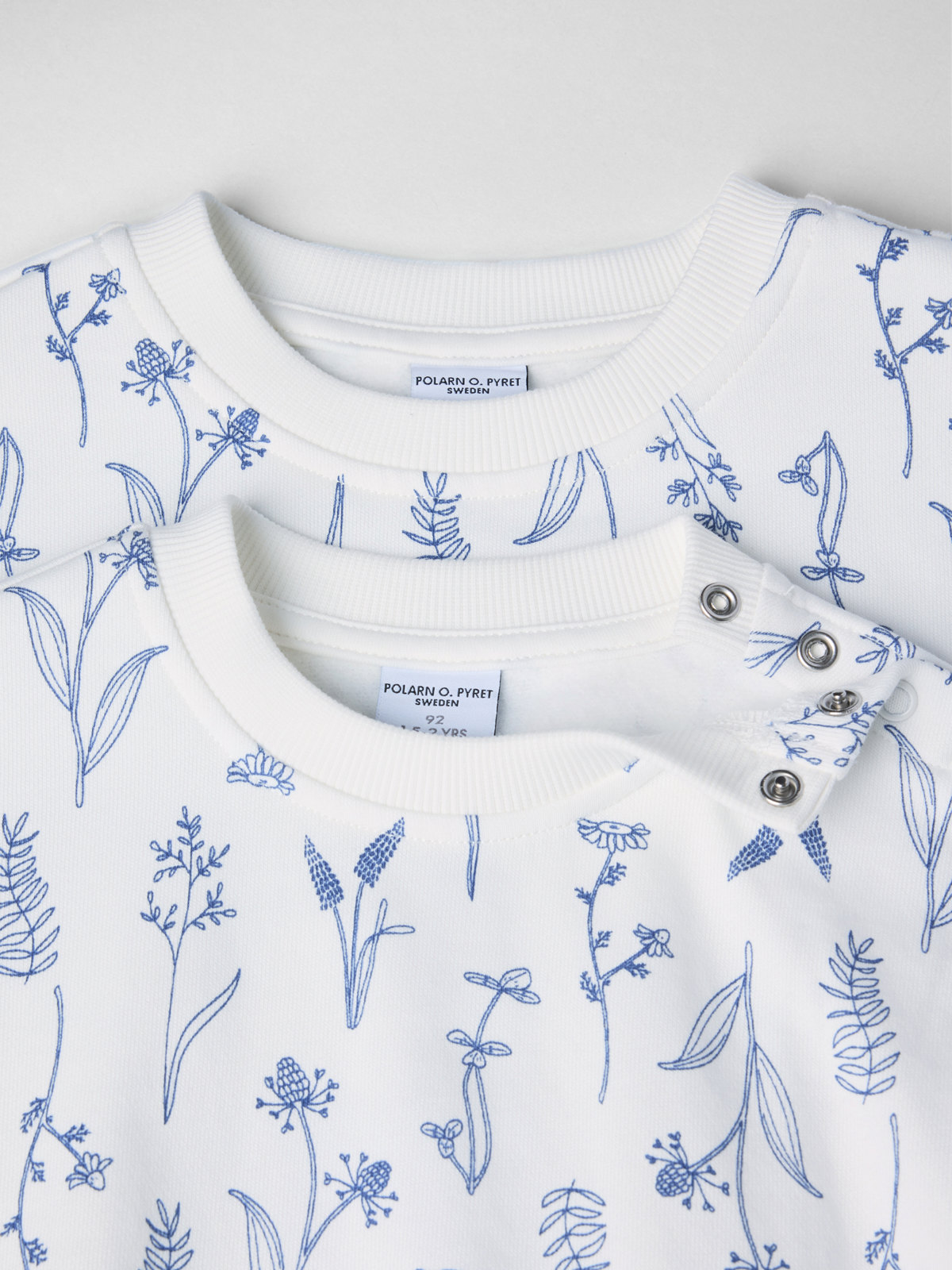 Størrelsene 86–92 har trykknapper bak på den ene skulderen for enklere klesskift.