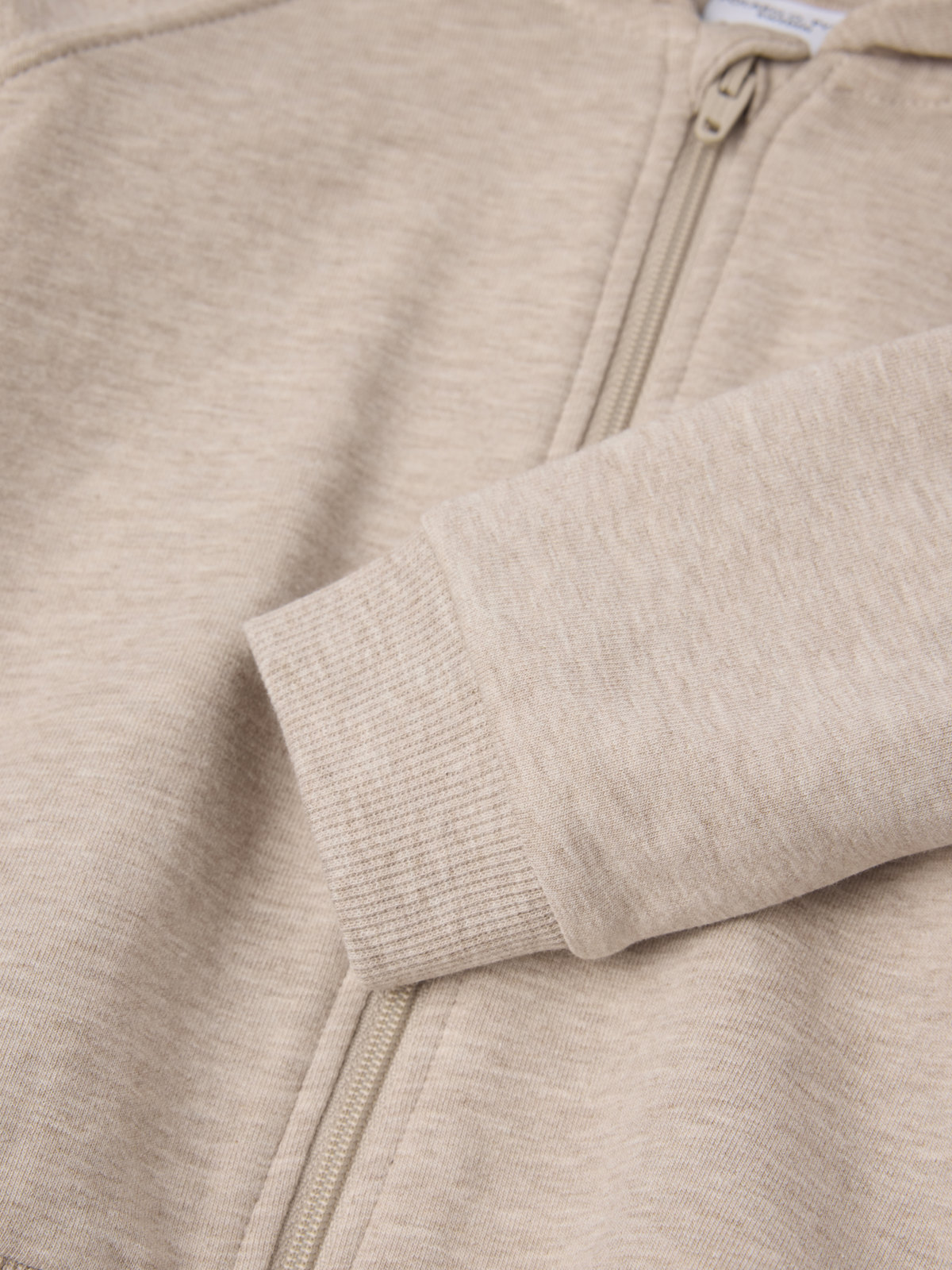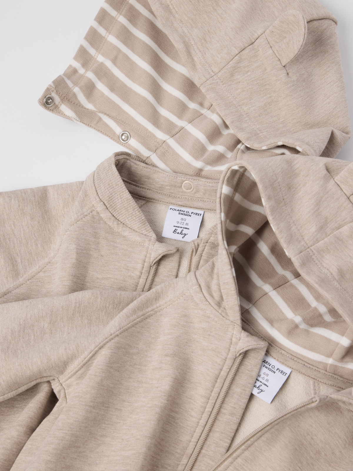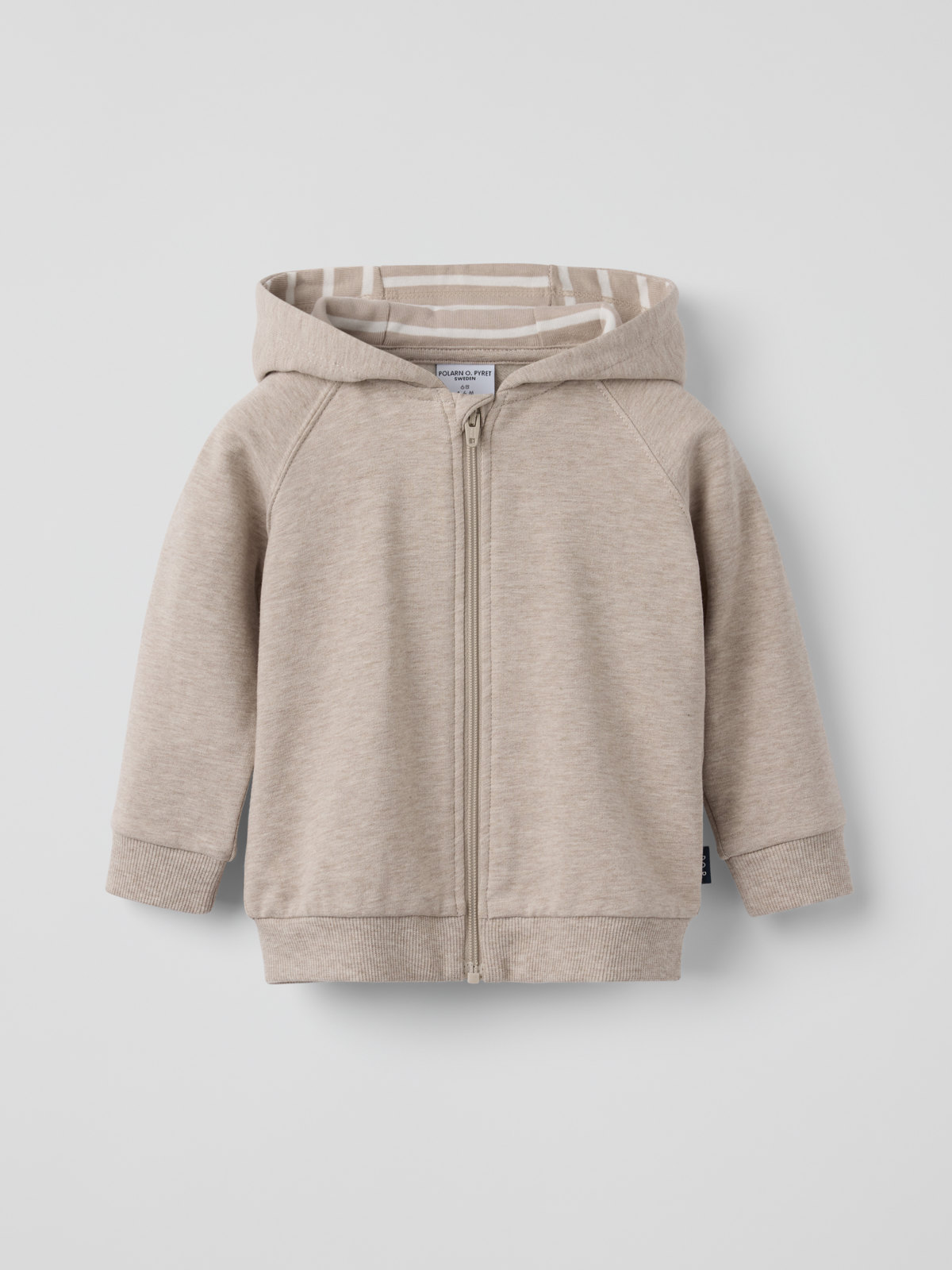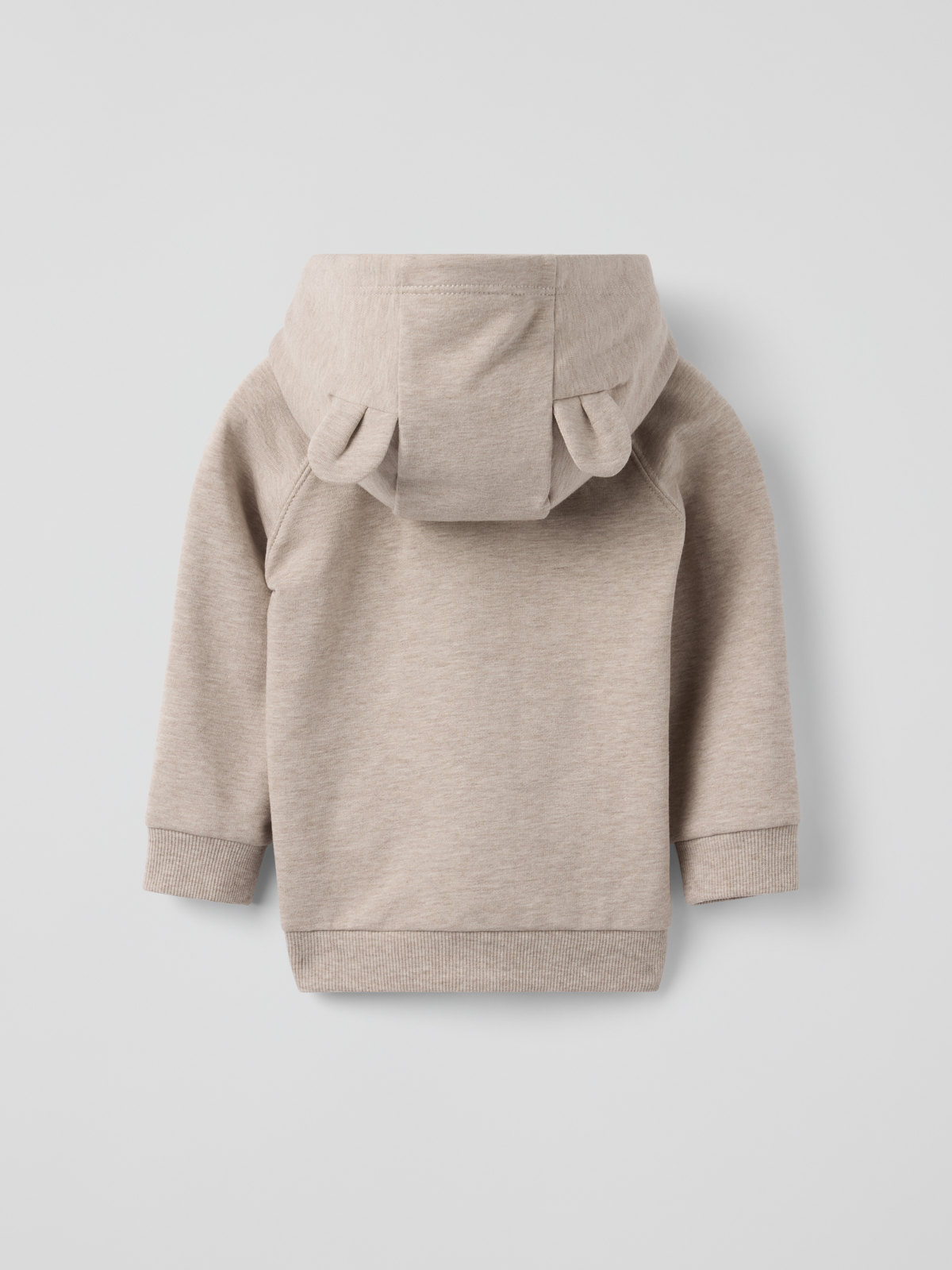 Melert hettegenser i behagelig sweatshirtskvalitet av 100 % økologisk bomull for baby. Genseren har myk, børstet innside og fast hette med trikotfôr i våre klassiske striper. Hetten er også pyntet med små ører.