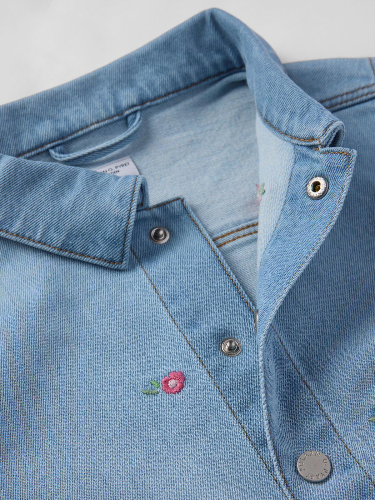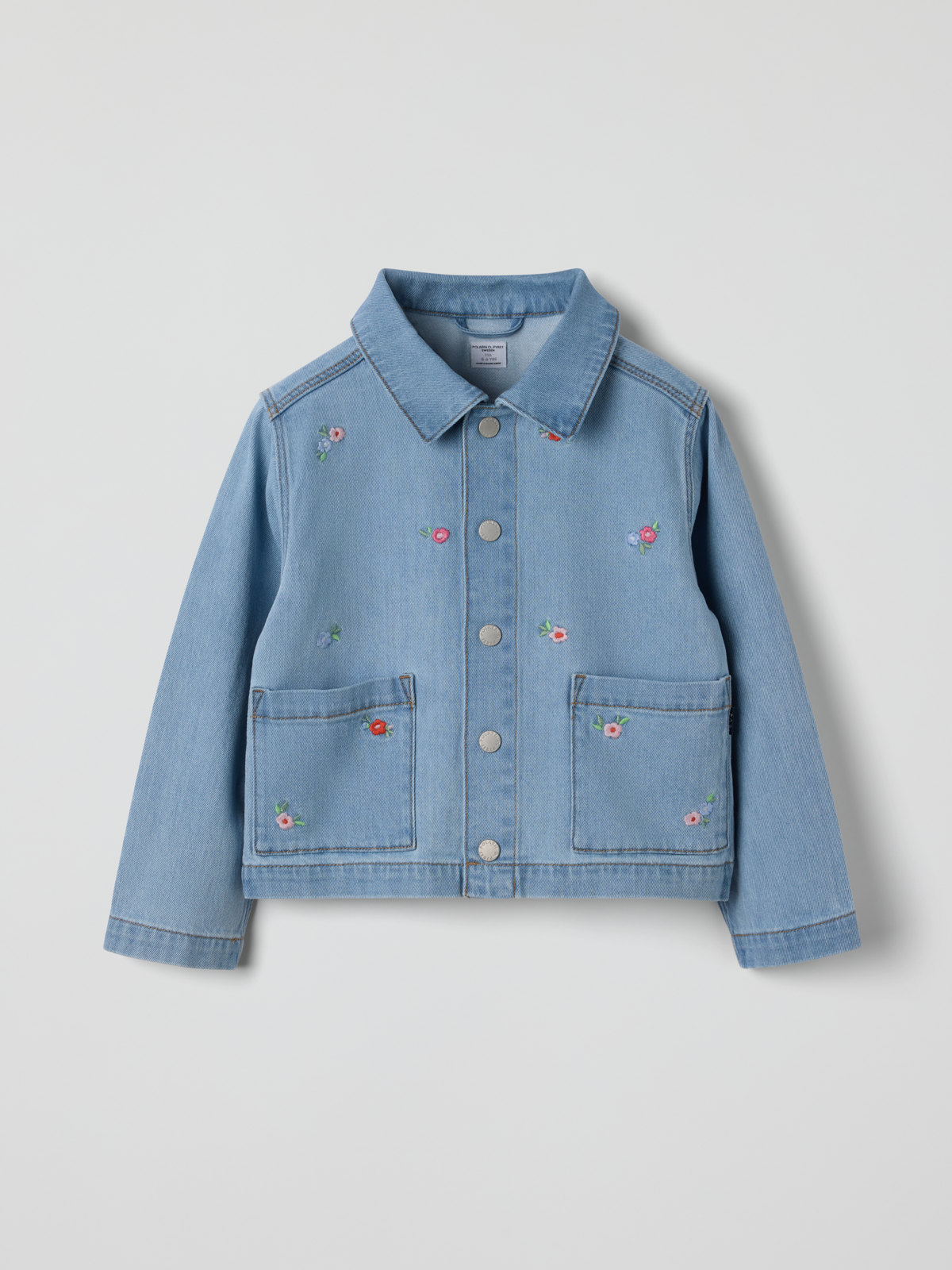Dongerijakke i myk og behagelig denim med lett stretch – perfekt for fine vår- og høstdager! Jakken har små broderte blomster og to store lommer foran. Den lukkes med trykknapper.