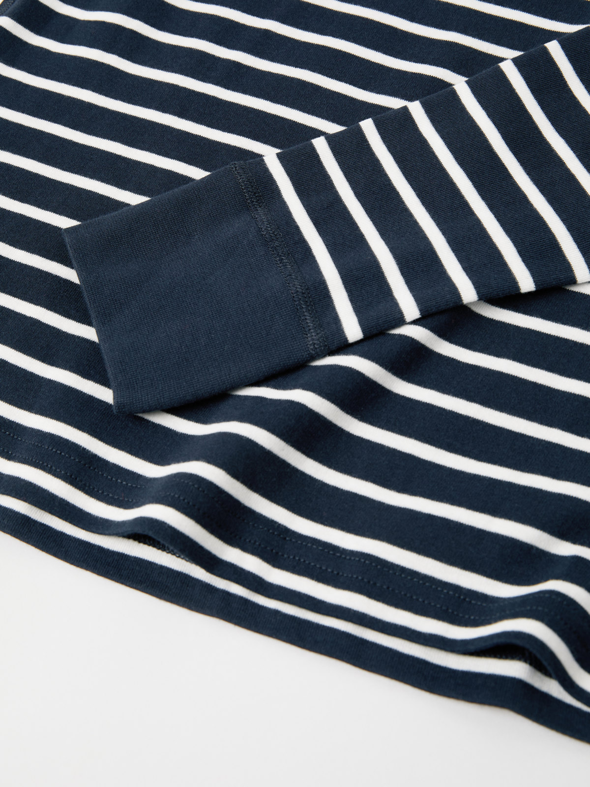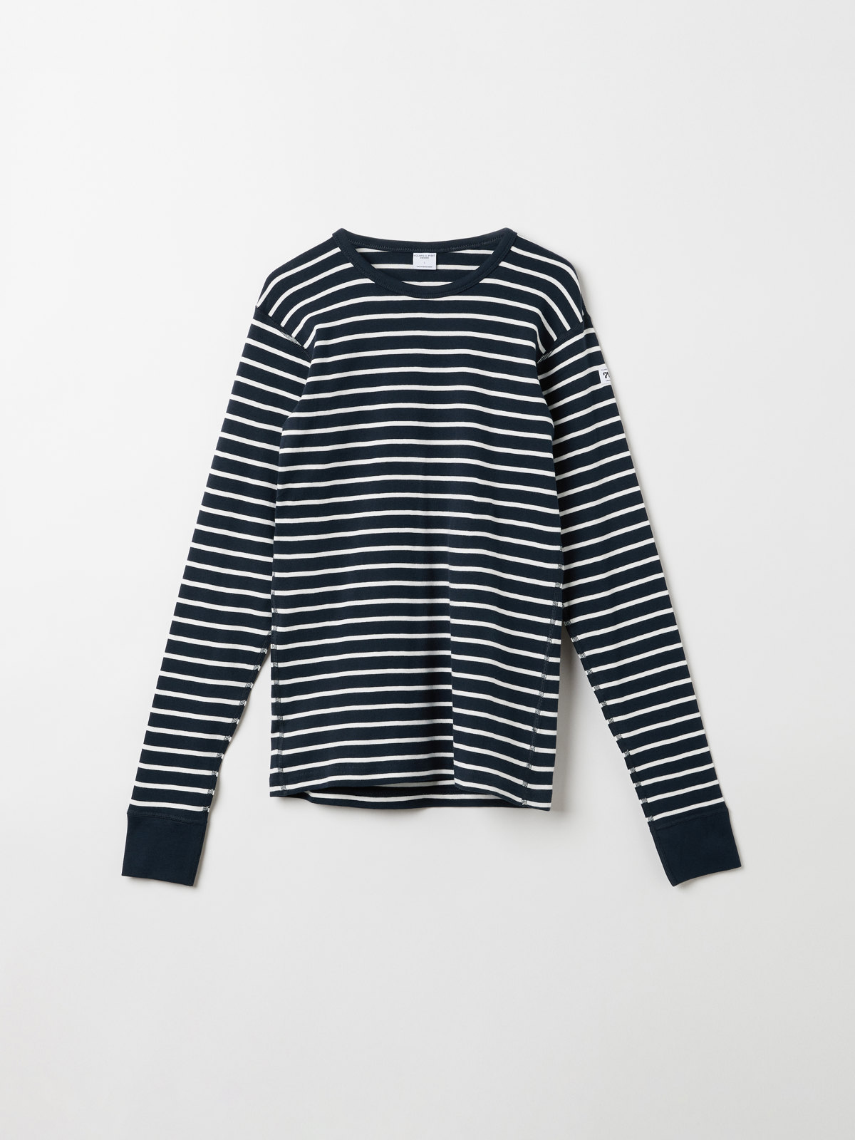 Stripet genser i 100 % økologisk bomull. Genseren har våre klassiske striper og myk ribbestrikket vrangbord nederst på ermene.