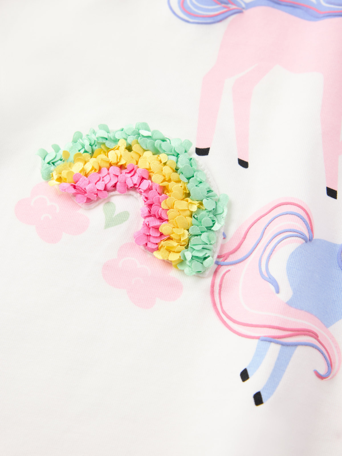 Tynn og behagelig genser i myk økologisk bomullstrikot – en favoritt å elske lenge! Genseren har et stort trykk med enhjørninger og regnbuer, der regnbuene stikker ut fra stoffet.