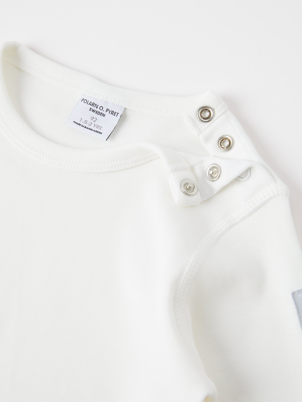Ensfarget genser i 100 % økologisk bomull. Genseren har myk, elastisk vrangbord rundt halsringningen og nederst på ermene. Størrelsene 74-92 har trykknapper på den ene skulderen for enklere klesskift.