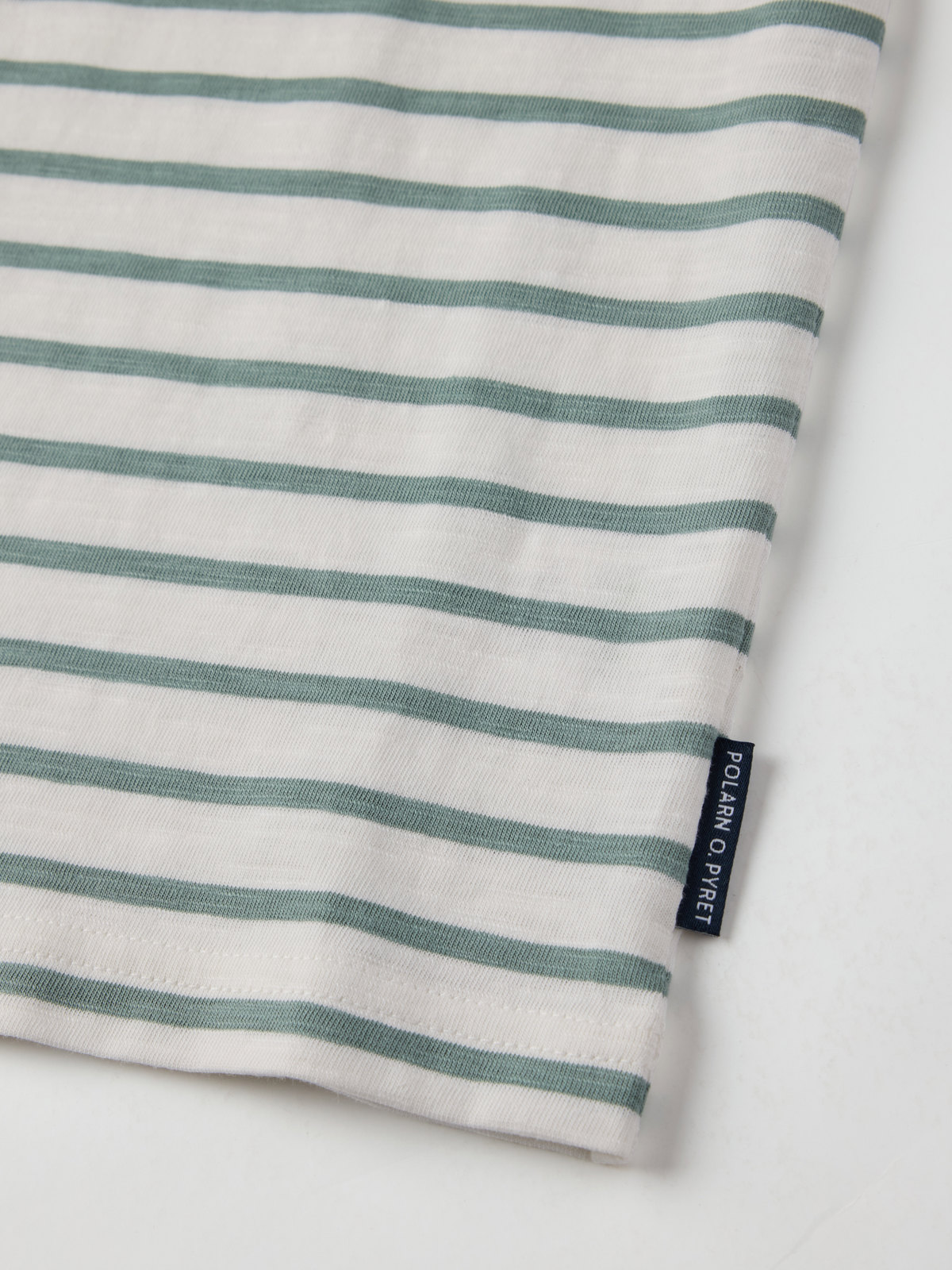 Stripet genser i 100 % tynn økologisk bomull. Genseren egner seg ypperlig til solfylte utflukter, siden den beskytter mot sterk sol og er sval og deilig. Størrelsene 86-92 har trykknapper på den ene skulderen for enklere klesskift.