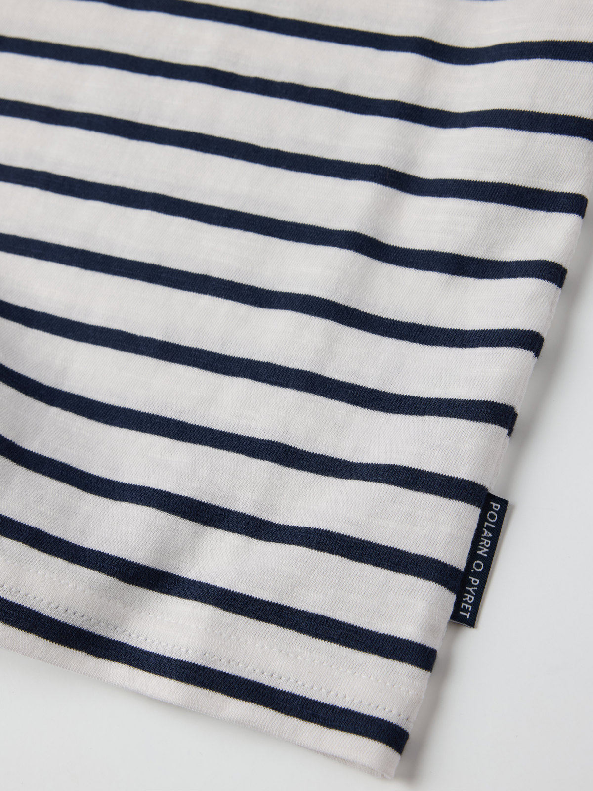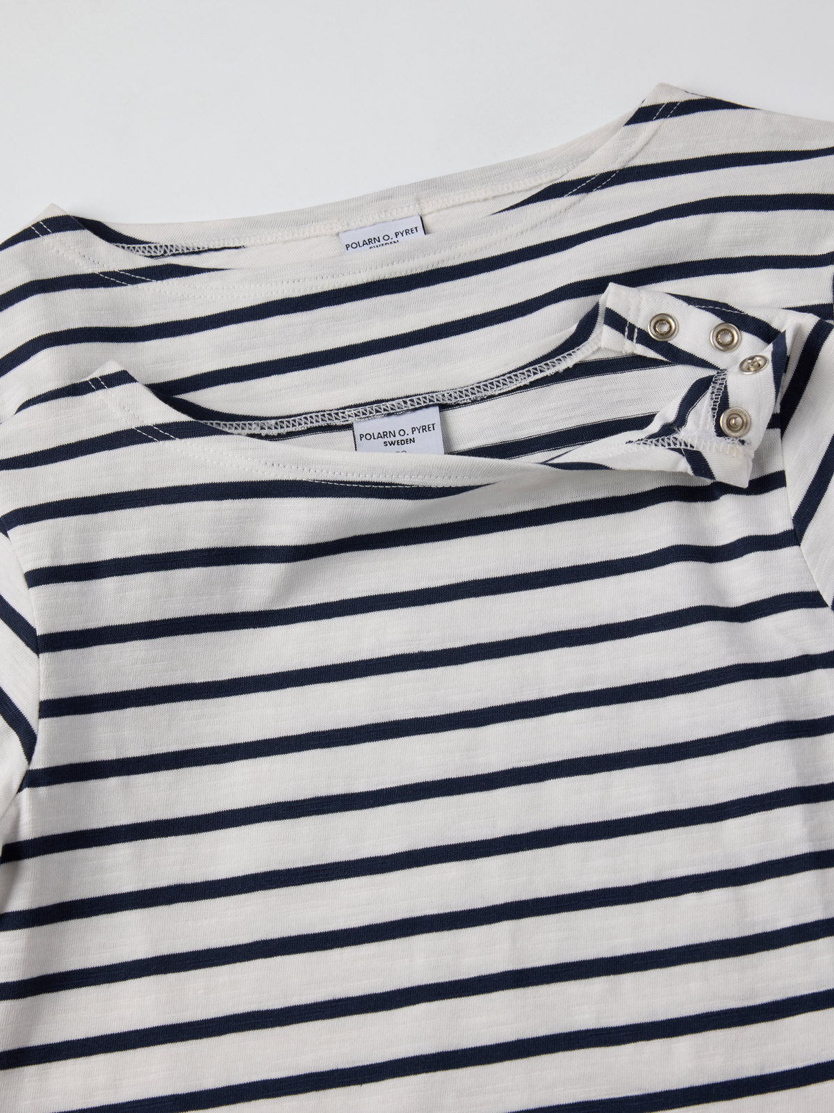 Stripet genser i 100 % tynn økologisk bomull. Genseren egner seg ypperlig til solfylte utflukter, siden den beskytter mot sterk sol og er sval og deilig. Størrelsene 86-92 har trykknapper på den ene skulderen for enklere klesskift.