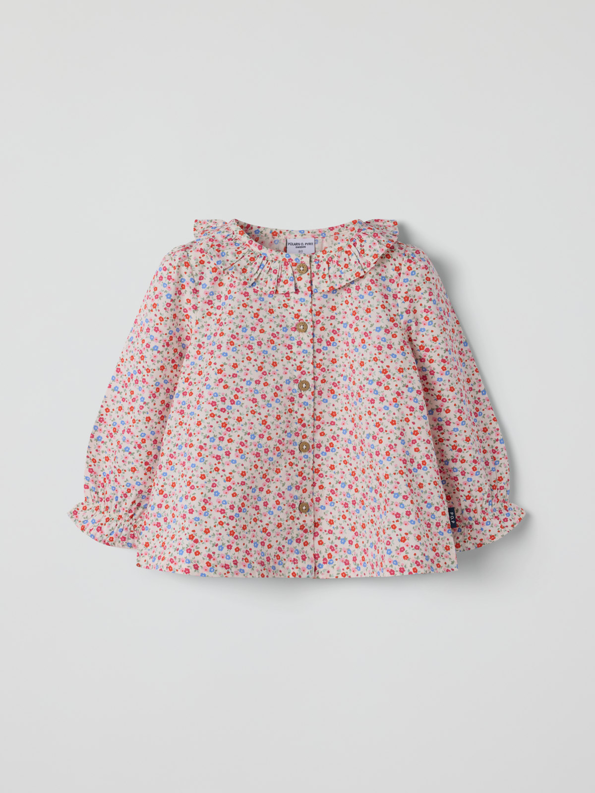 Bluse i lett musselin av 100 % økologisk bomull. Blusen har rynket kant nederst og fine volanger ved halsen og ermene. Kneppes foran. Perfekt for søskenmatch! muslin bluse