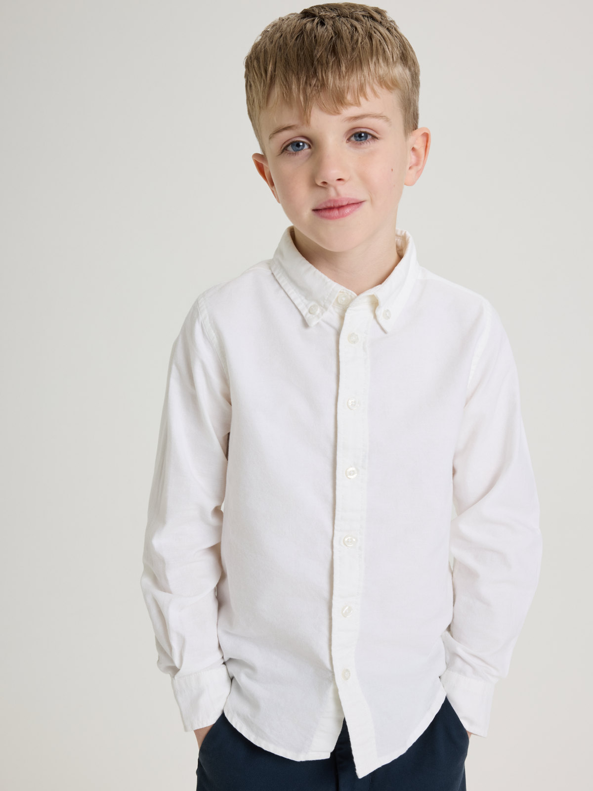 Vevd oxfordskjorte med buttondown-krage. Skjorten er i 100 % økologisk bomull og har skulderskjæring med fold i ryggen.