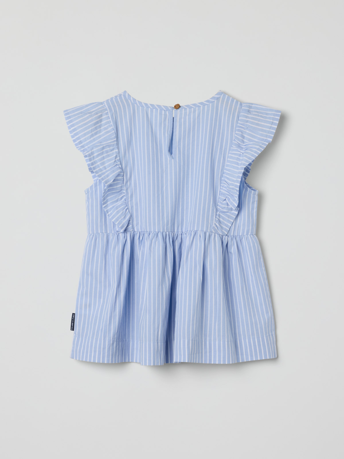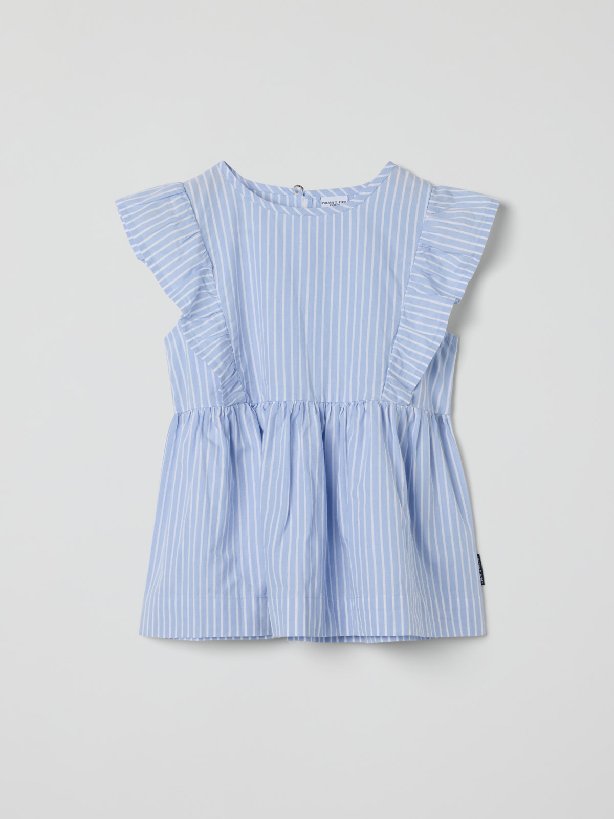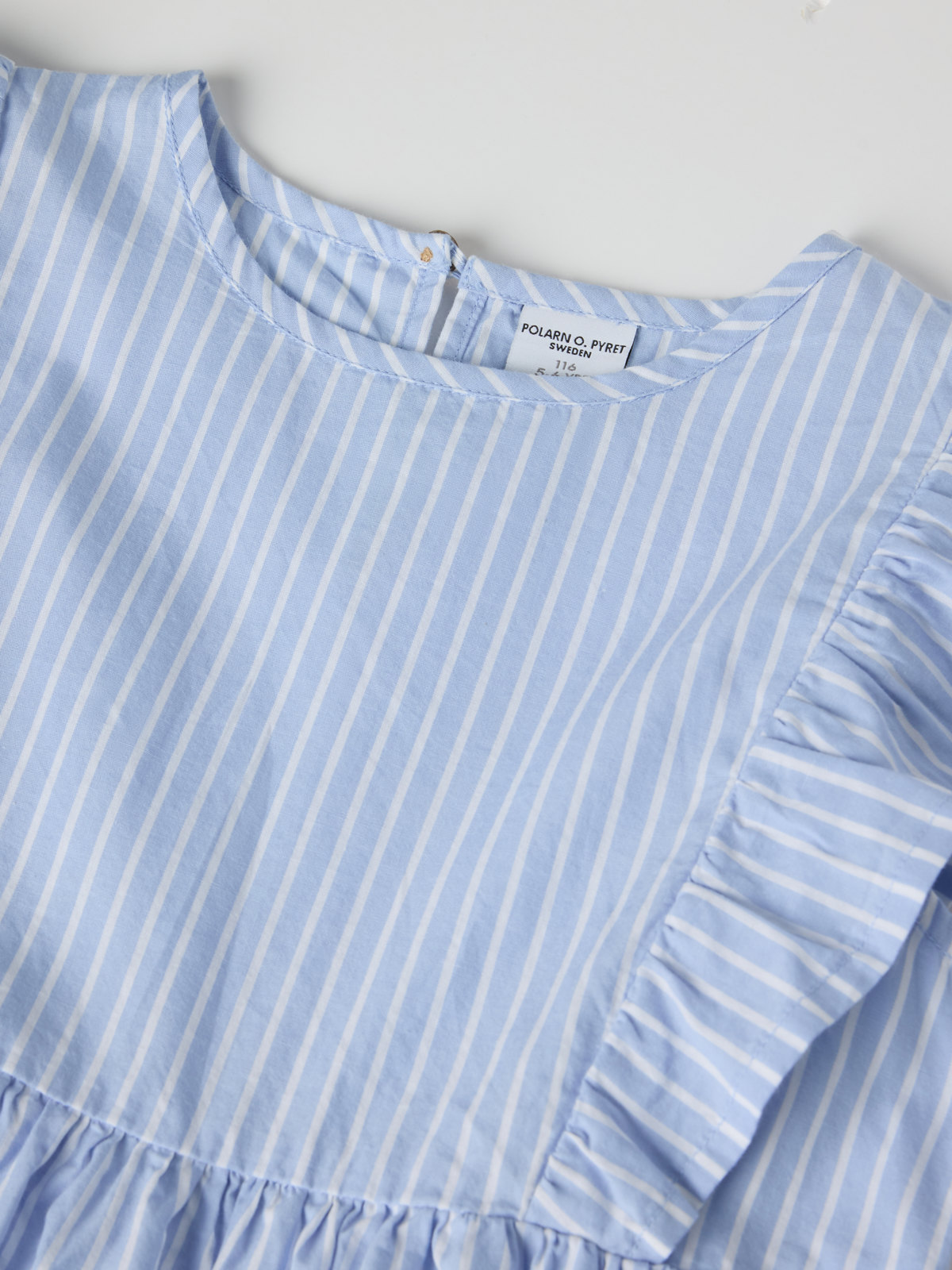 Søt stripet topp i tynn og myk poplin av økologisk bomull – en klar favoritt til både skoleavslutning og sommerfest! Toppen har myke volanger over skuldrene og rynket nederkant med fint fall. Den lukkes med knapp i ryggen.