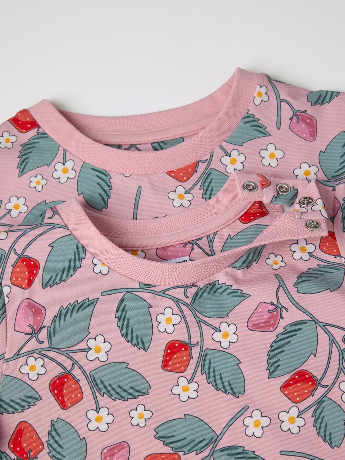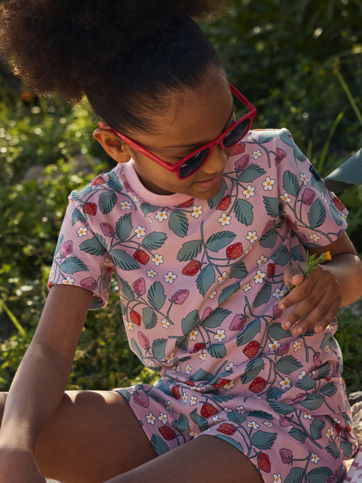 T-skjorte i myk økologisk bomull, helmønstret med jordbær – en skikkelig sommerfavoritt å elske lenge og som passer til alt! T-skjorten finnes i flere farger og trykk som matcher fint med hele kolleksjonen. Finn din favoritt!