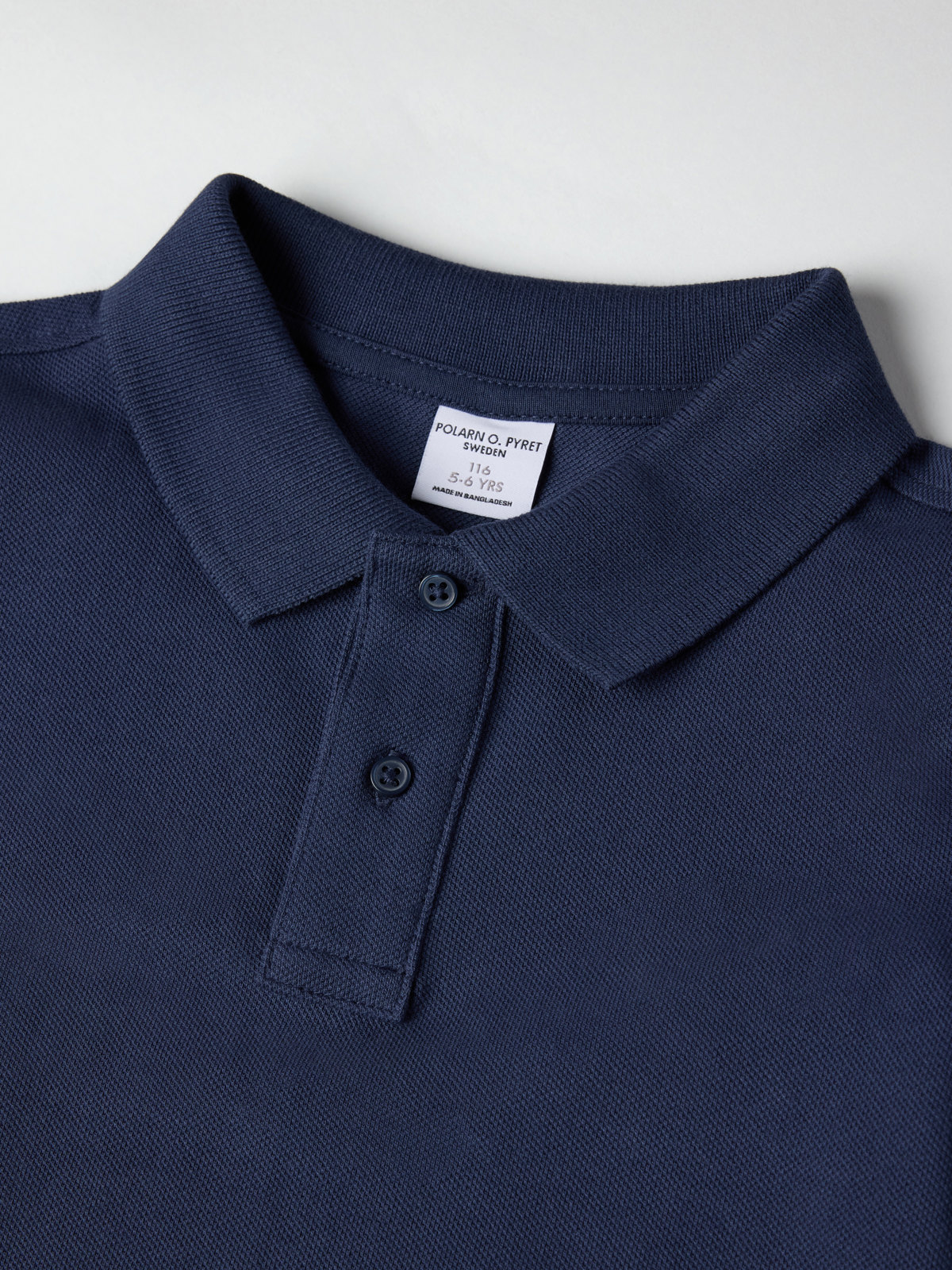 Ensfarget pikétrøye i 100 % økologisk bomull. Et perfekt basisplagg i barnegarderoben som passer til både hverdag og fest! Trøyen har ribbestrikket vrangbord nederst på ermene og myk krage med knappestolpe foran.