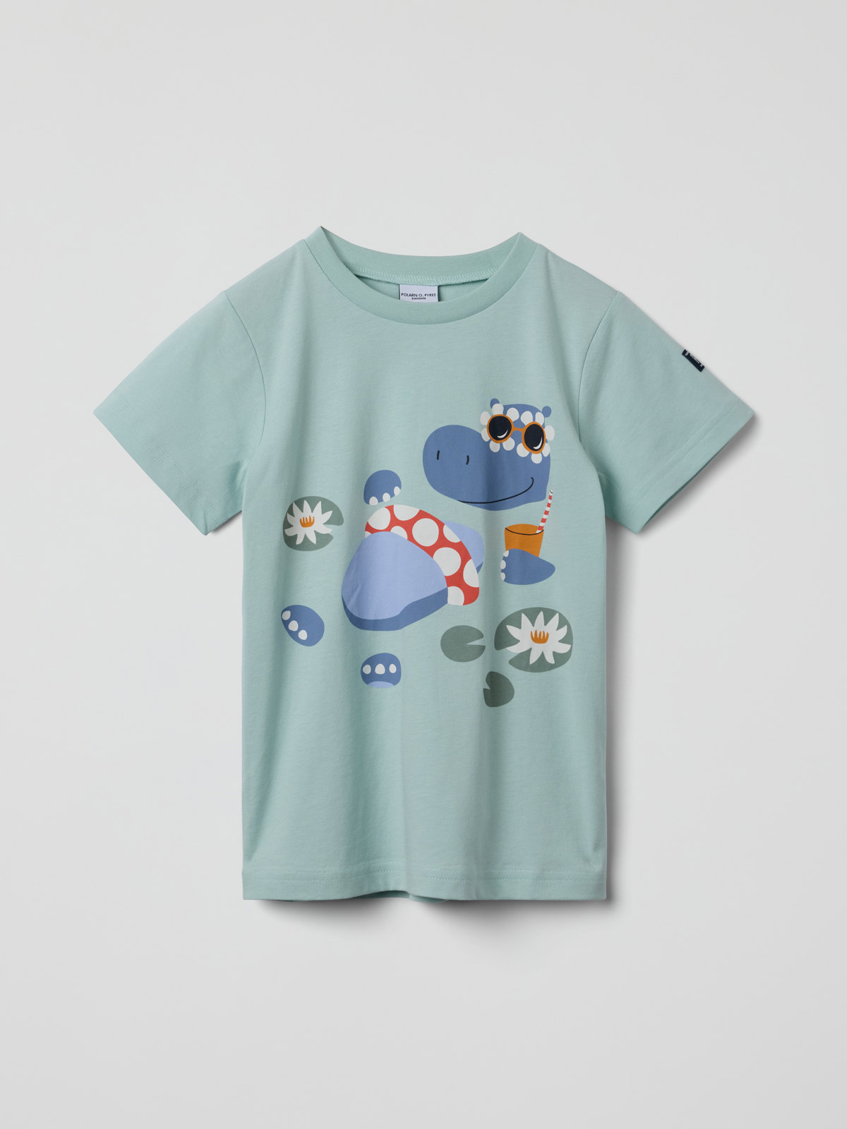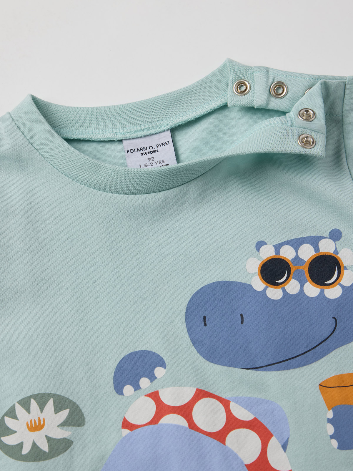 T-skjorte i 100 % økologisk bomull med festlig trykk på brystet. Passer perfekt til alle anledninger! T-skjorten finnes i flere farger og trykk som matcher fint med hele kolleksjonen. Finn din favoritt!