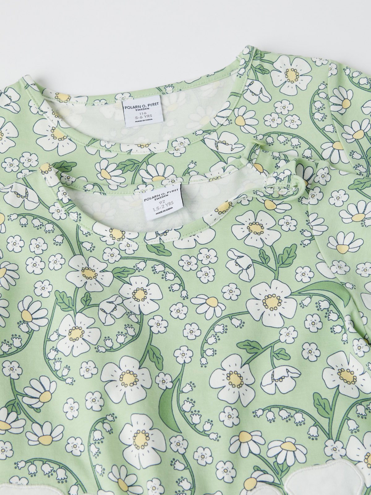 Blomstret trikottopp med puffermer og festlige lommer i myk økologisk bomull – fin til både fest og hverdags.