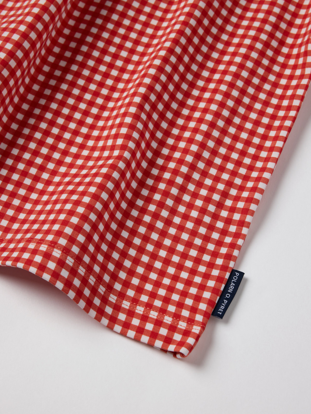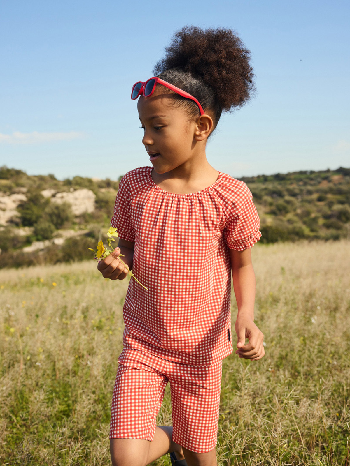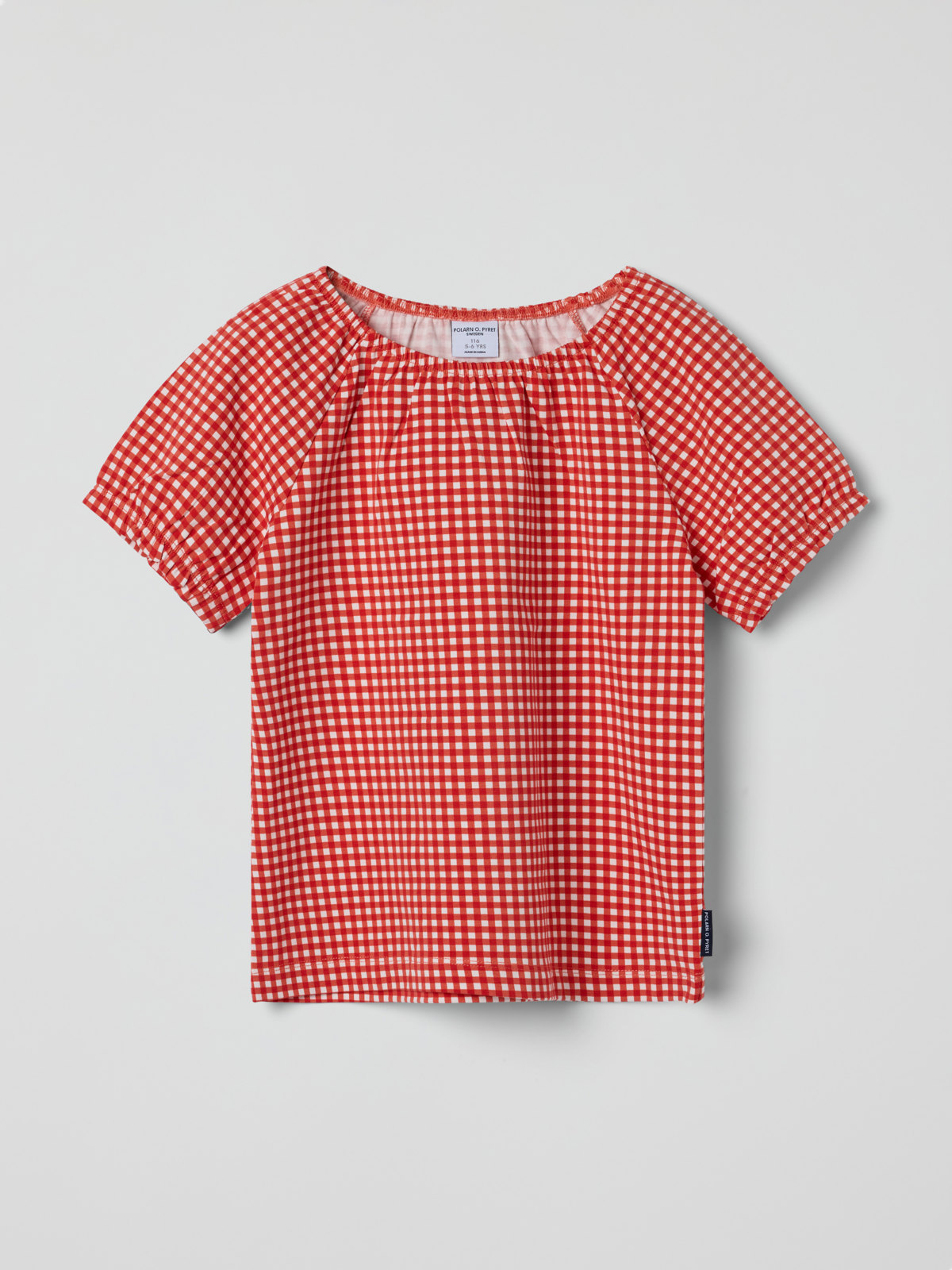Søt rutet topp i økologisk bomullstrikot med fine puffermer – en sommerfavoritt til både hverdag og fest! Toppen har strikk og små volanger nederst på ermene.