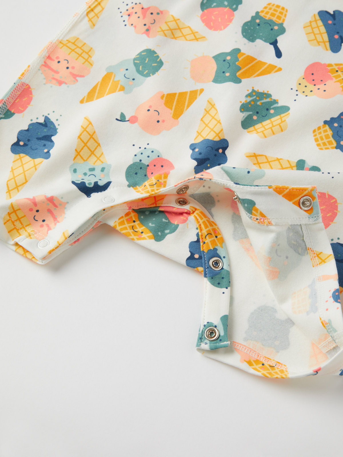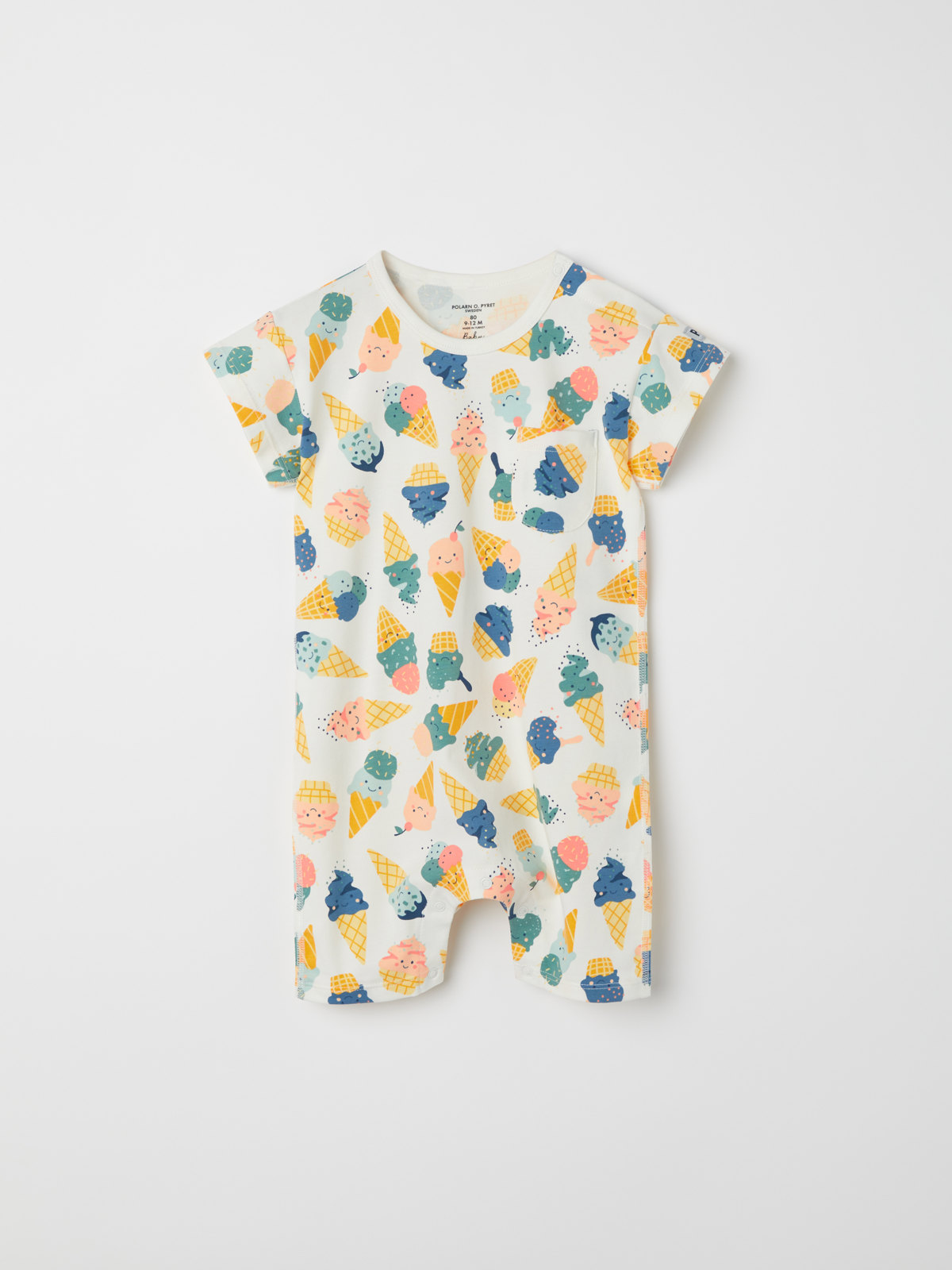 Playsuiten er helmønstret med iskremer og har ekstra myke, flate sømmer som ligger skånsomt mot følsom hud.