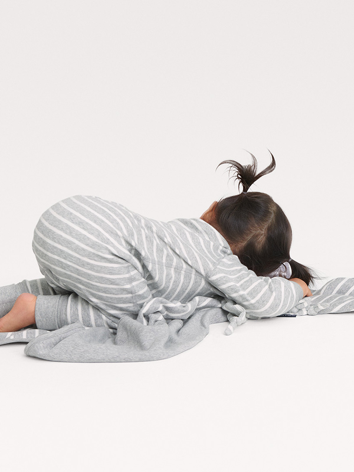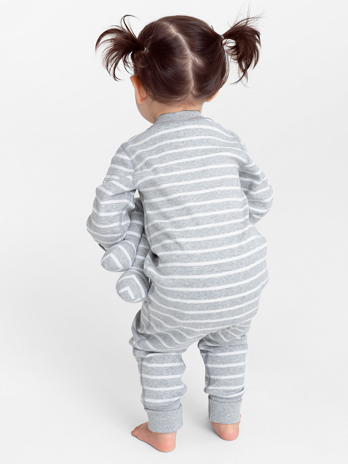 Stripet dress for baby i myk økologisk bomull. Dressen har våre klassiske striper og trykknapper fra hals til nederst på bena som gjør den lett å ta på og av. Vrangbordene er ekstra lange og kan brettes ned når barnet vokser.