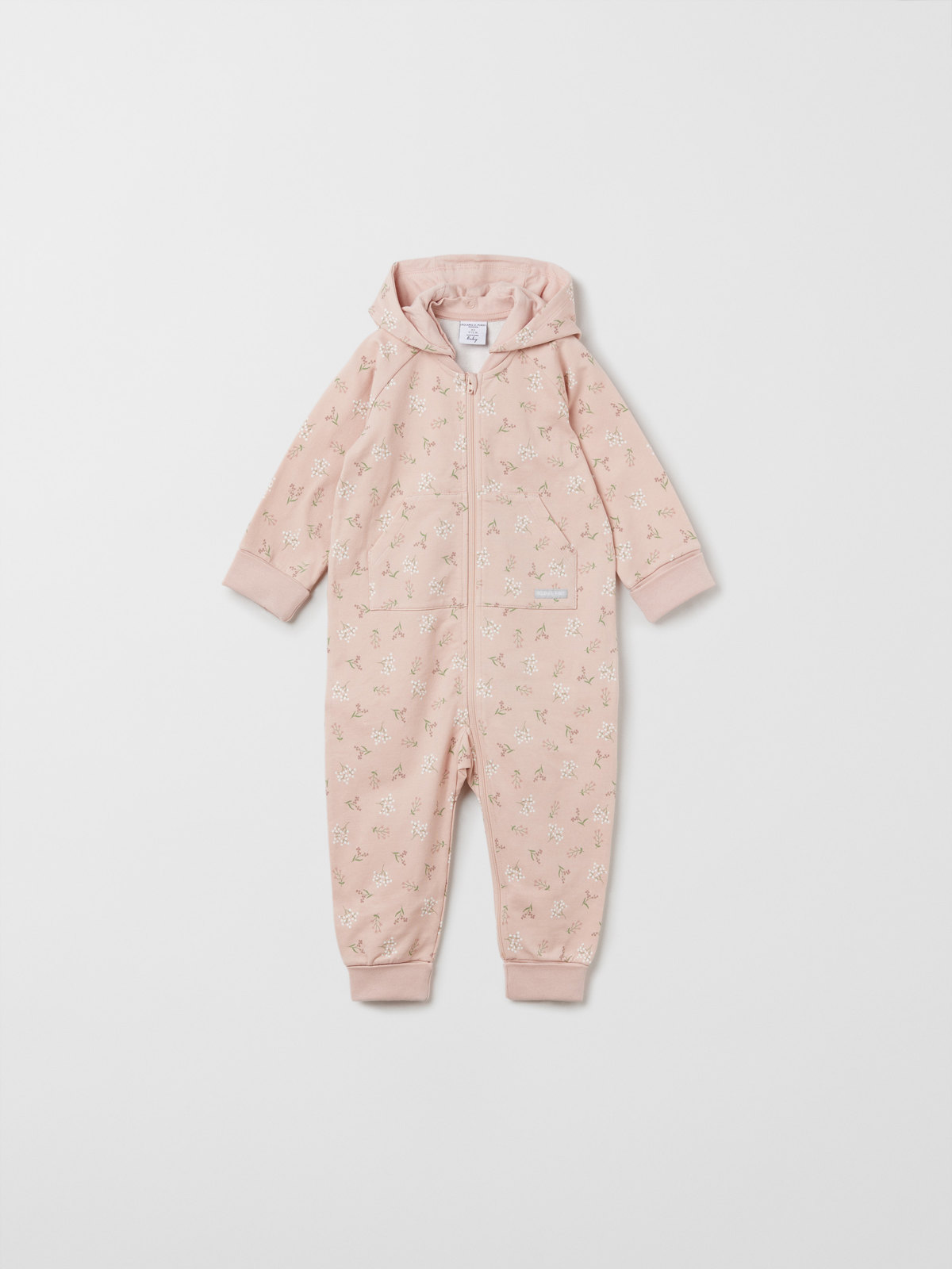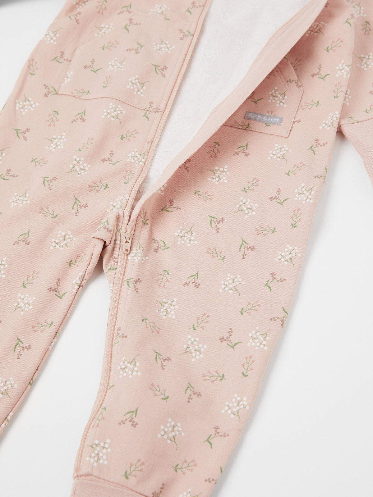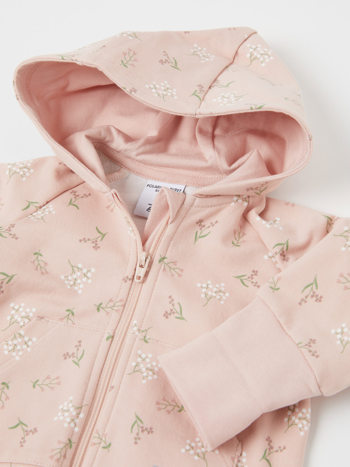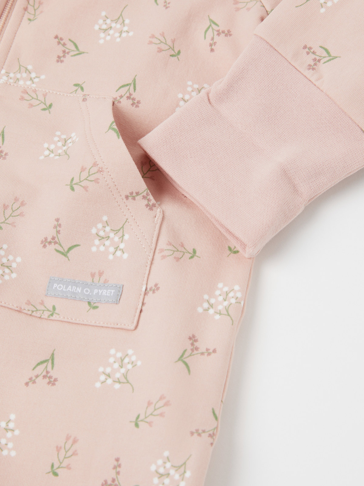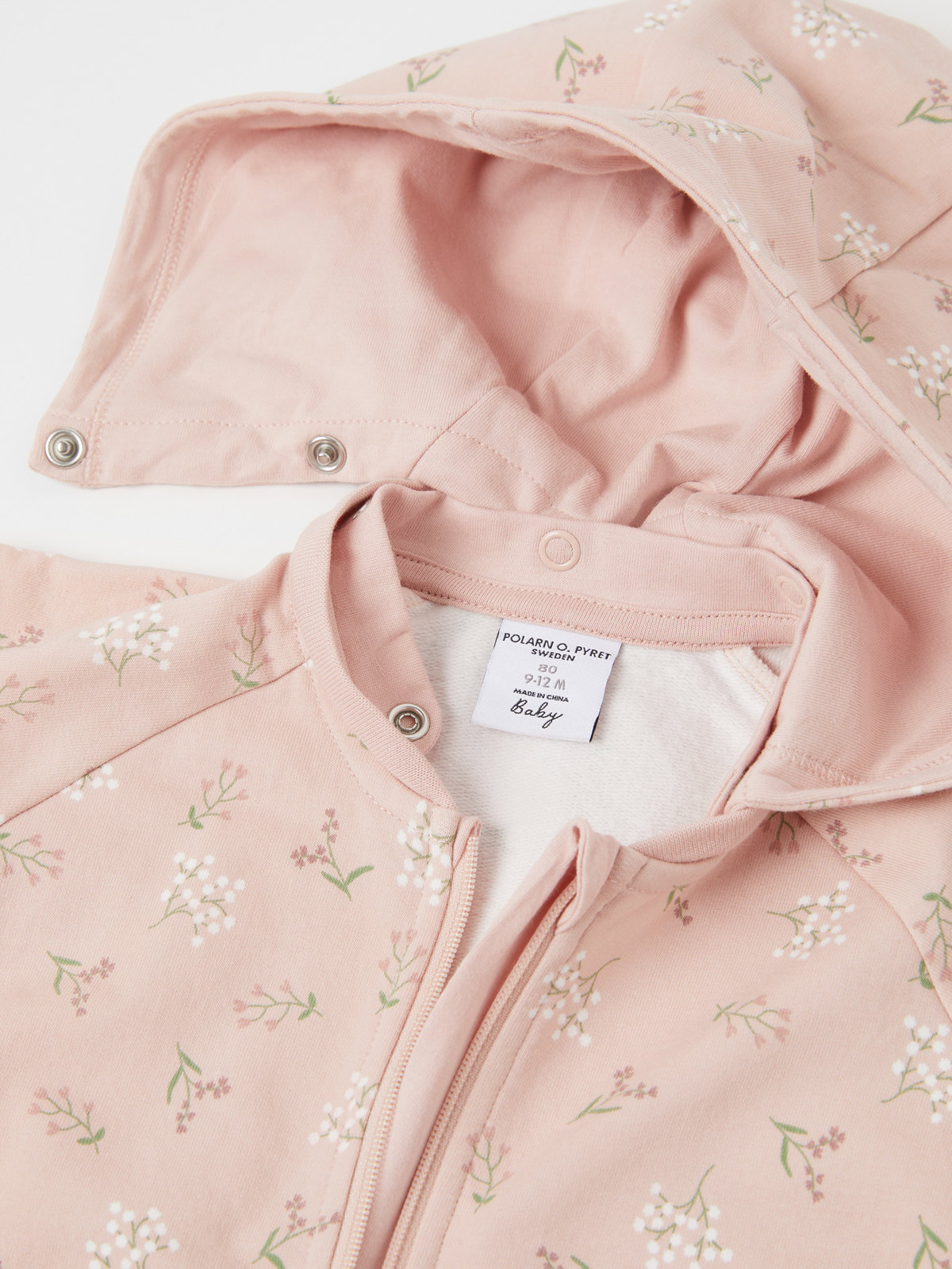 Dressen er helmønstret med små blomster og har en kengurulomme samt fast hette som er fôret med myk bomullstrikot.