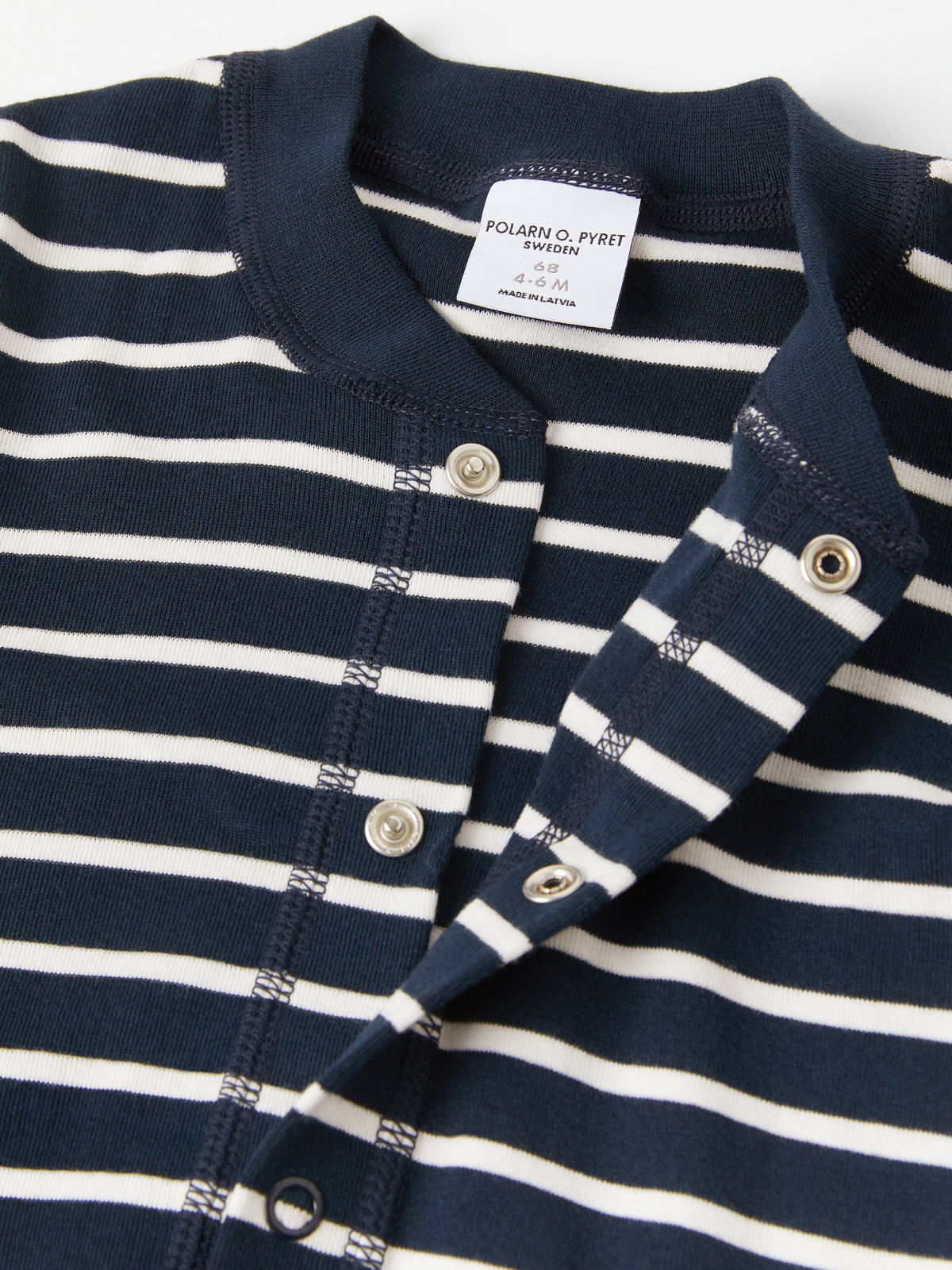 Dress til baby i økologisk bomull og med Polarn O. Pyret-striper. Trykknapper fra hals til benslutt gjør den lett å ta av og på. Mansjetter som kan brettes ned ettersom barnet vokser.