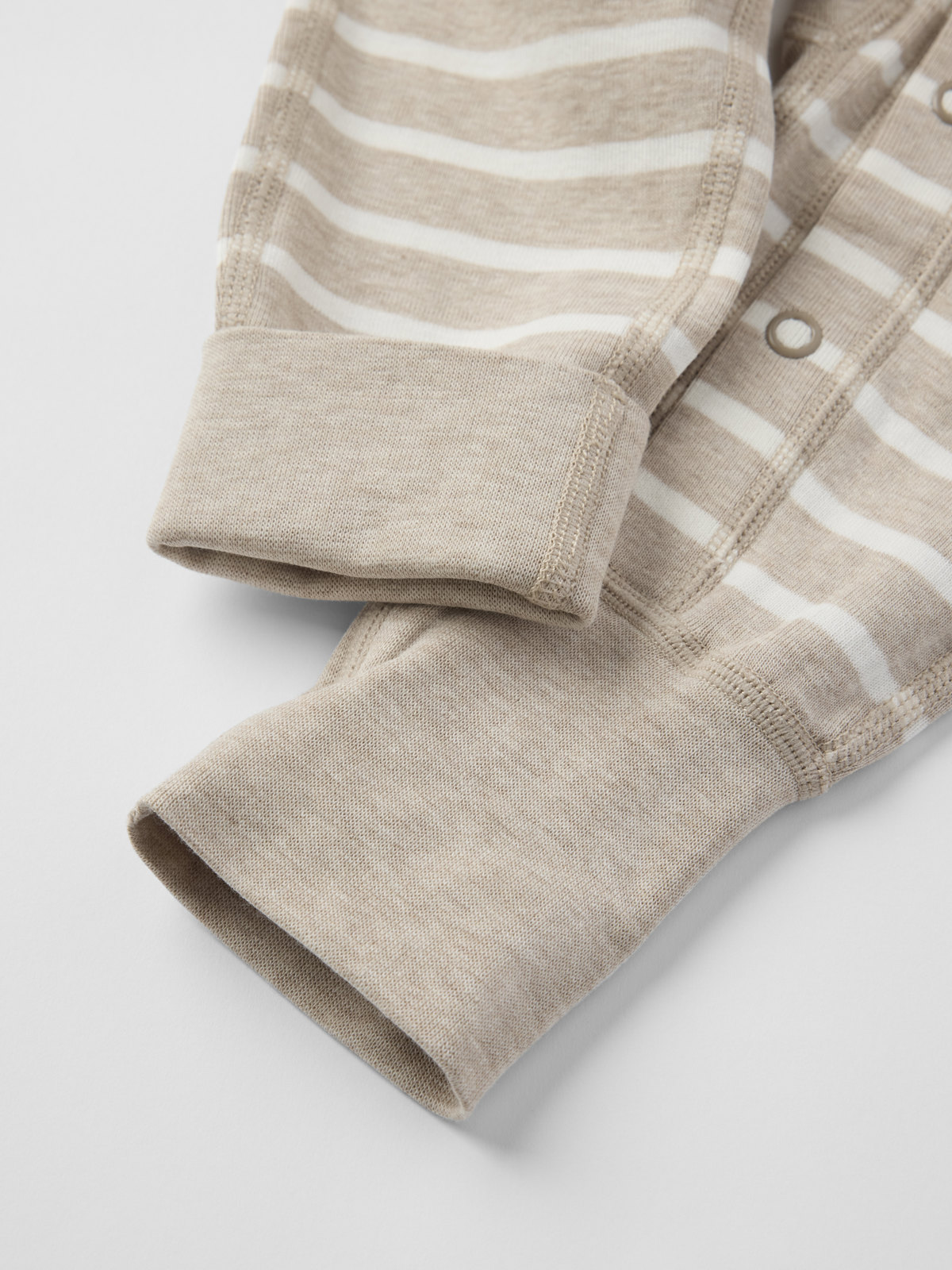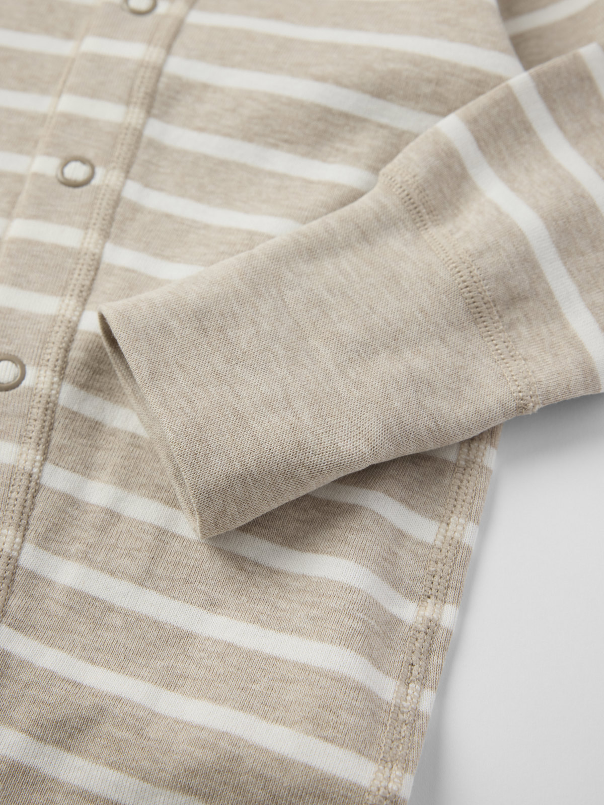 Vår klassiske stripete dress i myk økologisk bomull – perfekt som både pysj og koseplagg! Dressen har ekstra myke, flate sømmer som er skånsomme mot følsom hud. Vrangborden nederst på ermene og bena er ekstra lang og kan brettes ned etter hvert som barnet vokser. Den lange knappestolpen fra halsen til nederst på bena gir enklere klesskift.
