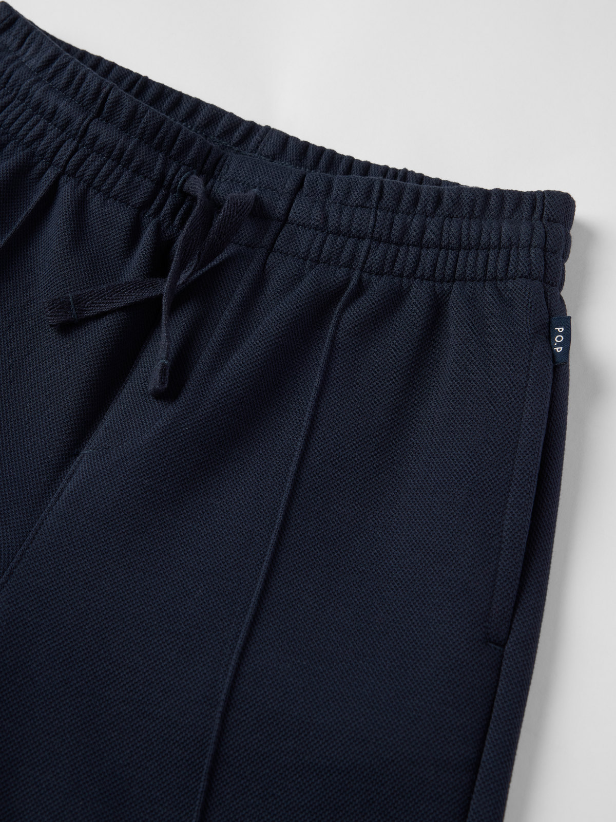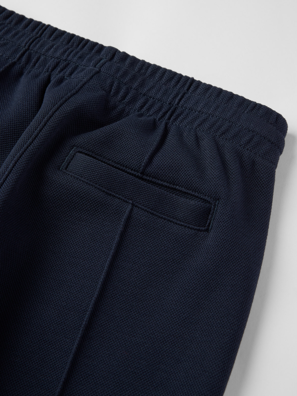 Bukse i myk piké av økologisk bomull og resirkulert polyester – komfortabel og fin til både hverdag og fest! Buksen har pressefolder foran og bak, sidelommer og baklomme. Midjen er elastisk og kan justeres med knytebånd.