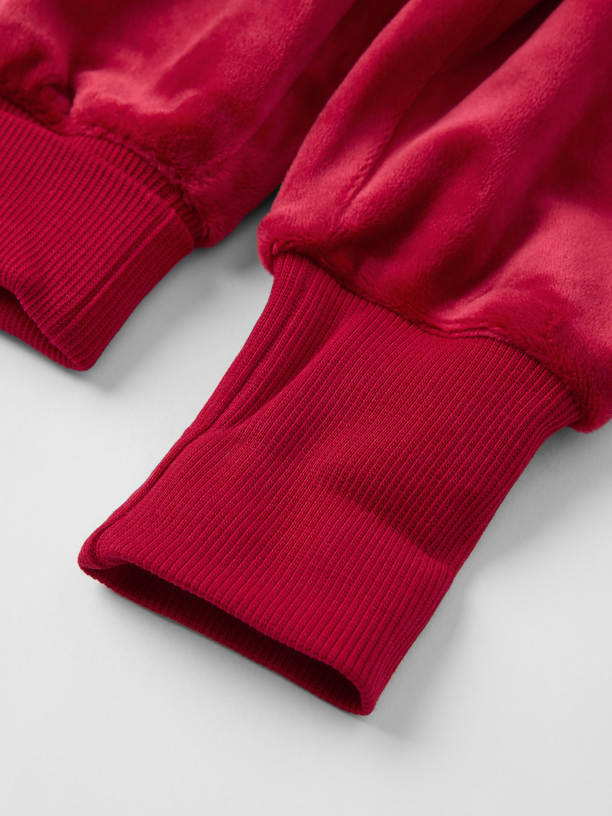 Myk og god velourbukse laget av resirkulert polyester – perfekt for små ben som vokser. Buksen har elastisk midje som kan reguleres med knapphullsstrikk. De ekstra lange vrangbordene nederst på bena kan brettes opp eller ned etter hvert som barnet vokser.