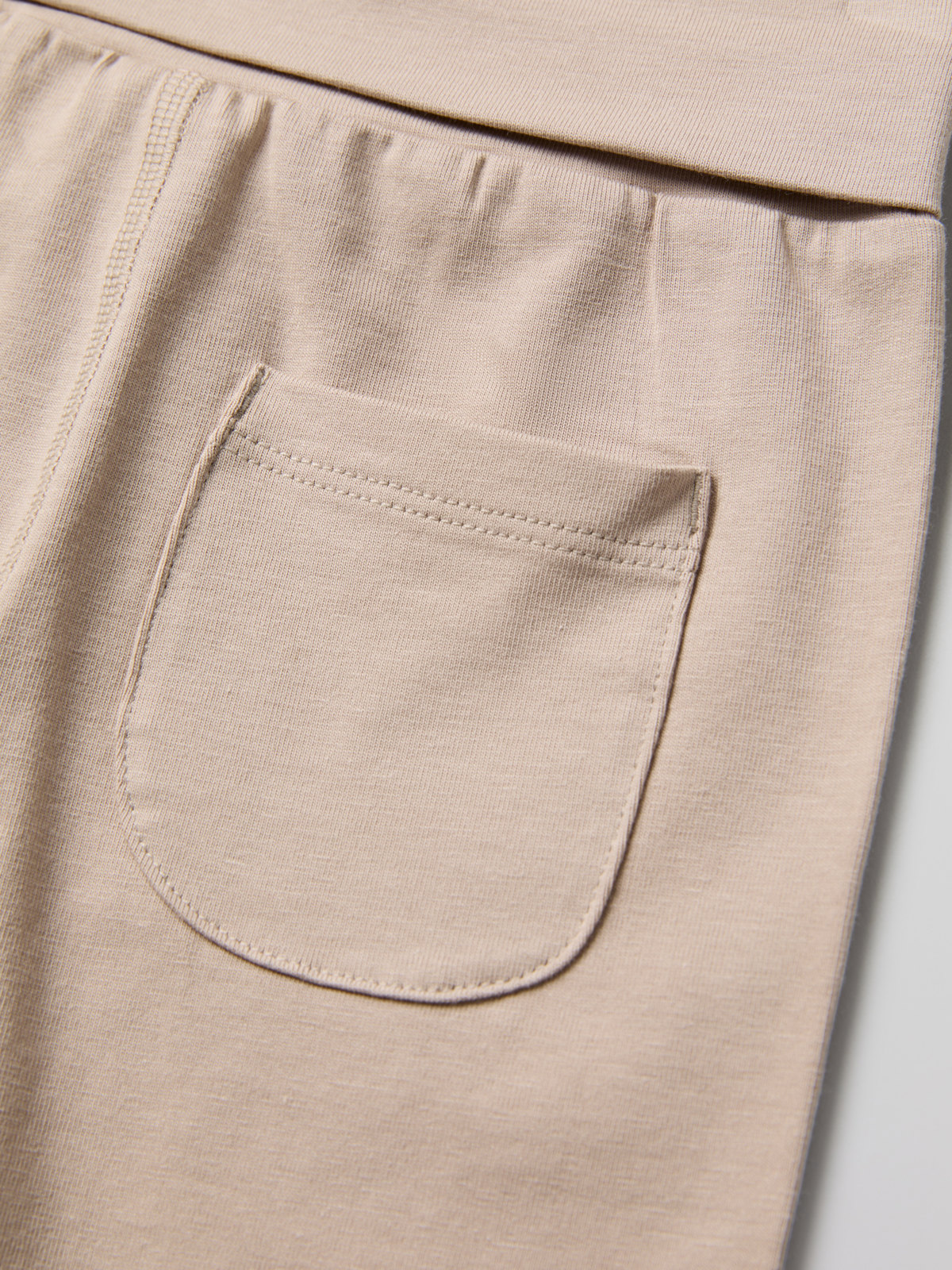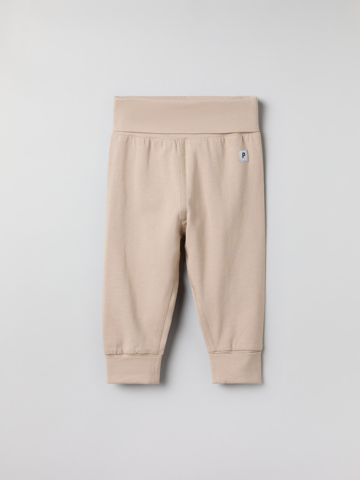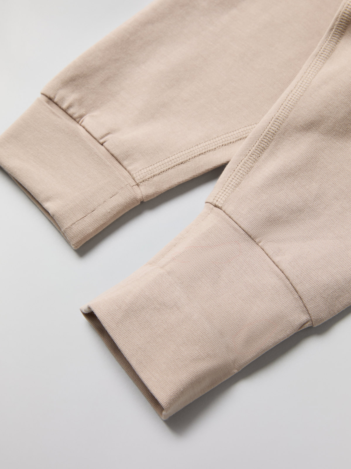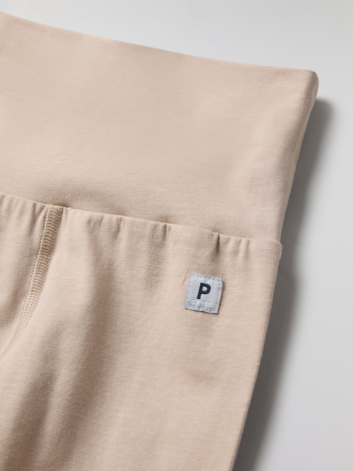 Buksen er ensfarget og har ekstra myke sømmer som ikke gnager mot følsom hud. Takket være de ekstra lange vrangbordene i midjen og nederst på bena, som kan brettes opp eller ned, kan barnet vokse en hel størrelse sammen med babyen.