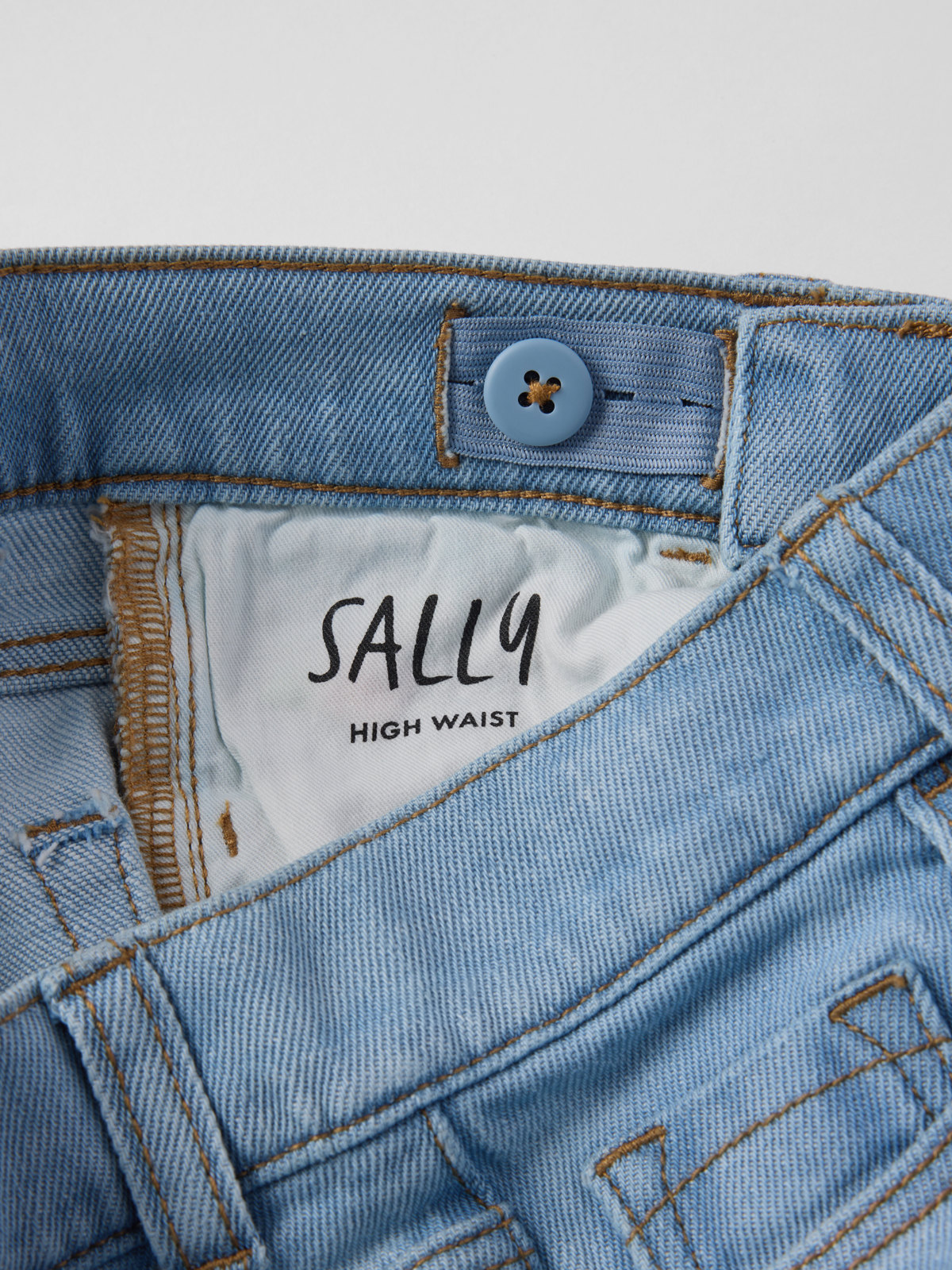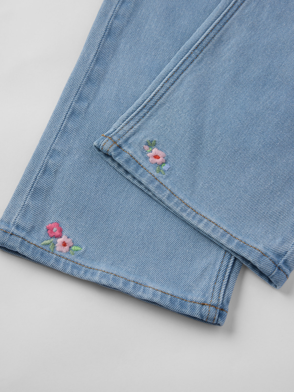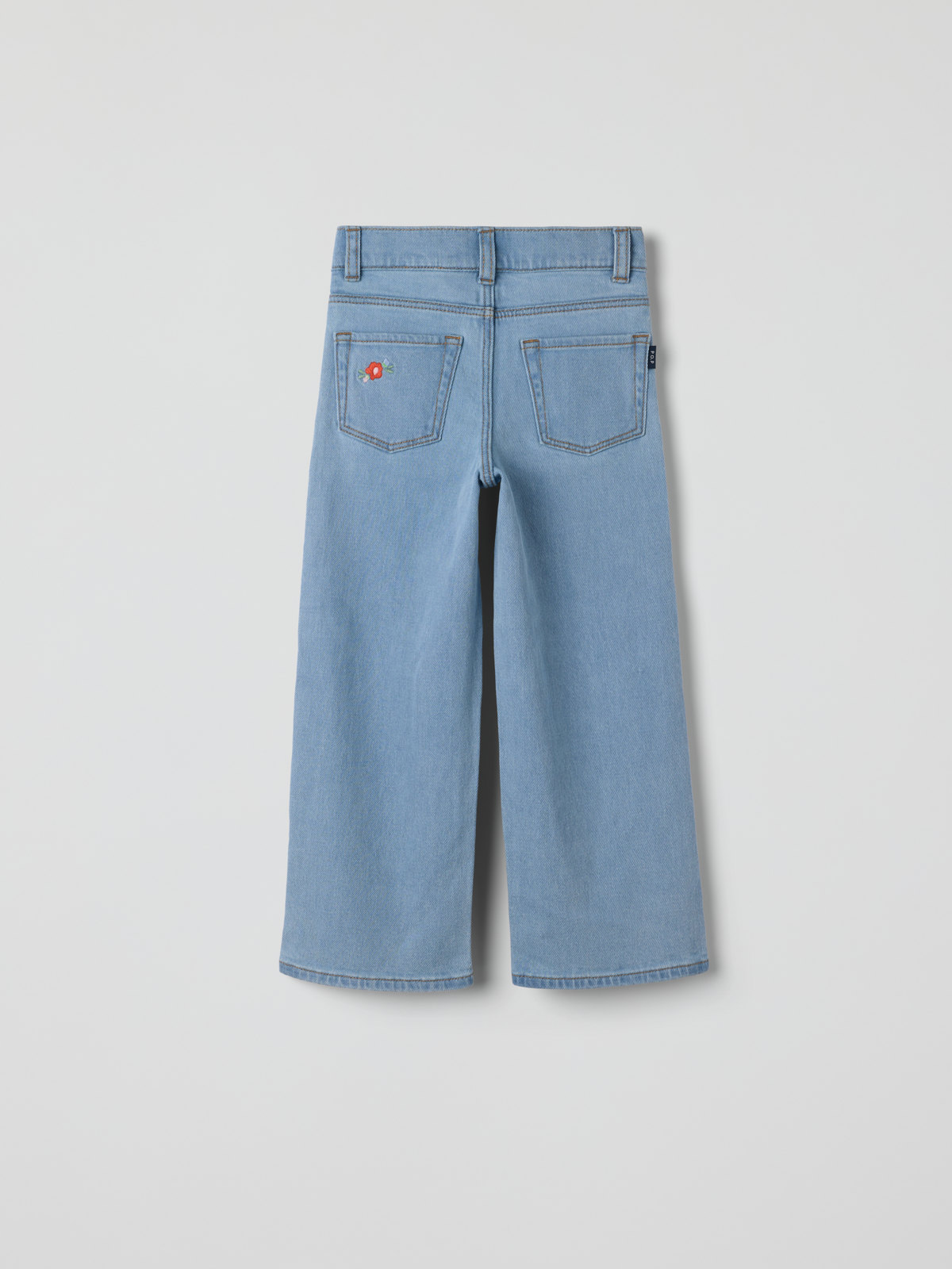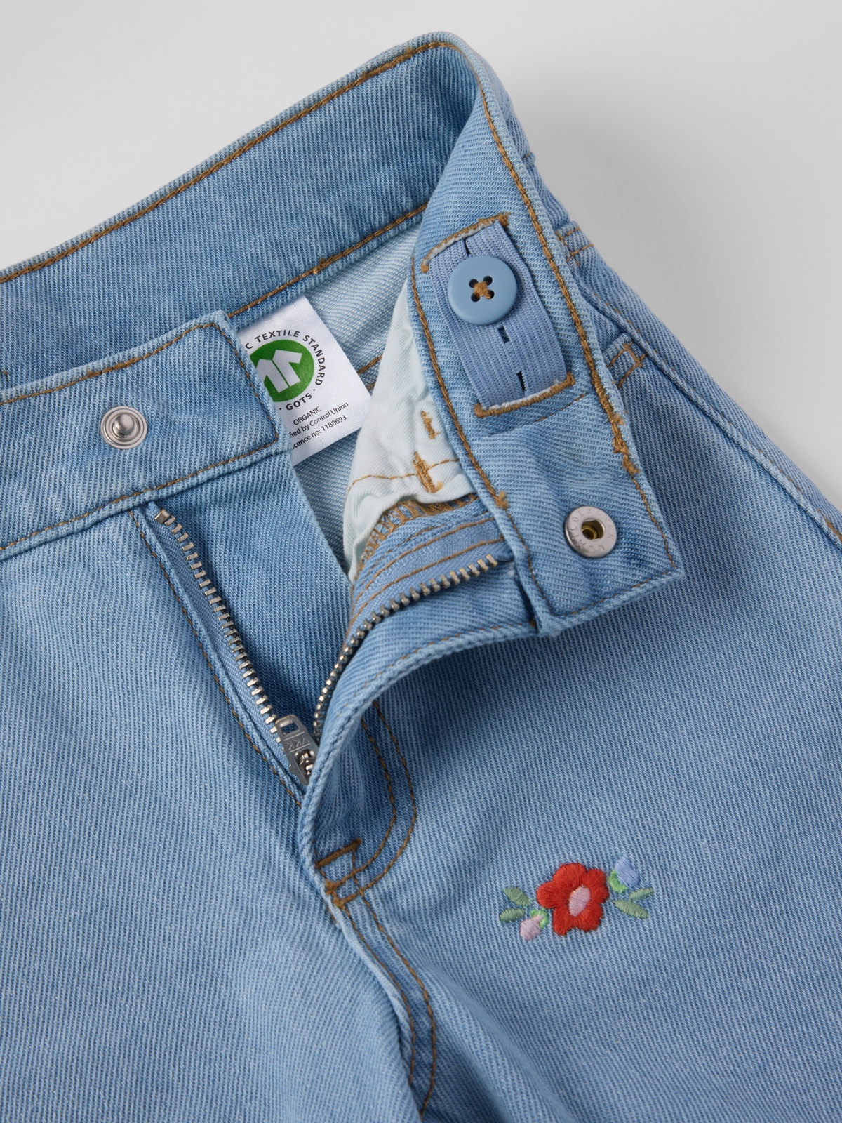 Våre stilrene jeans SALLY, laget i myk denim med søte broderier. En lekevennlig bukse i myk stretch med vide ben og høy midje. Alle våre jeans er fra våren 2022 laget av GOTS-sertifisert bomull.
