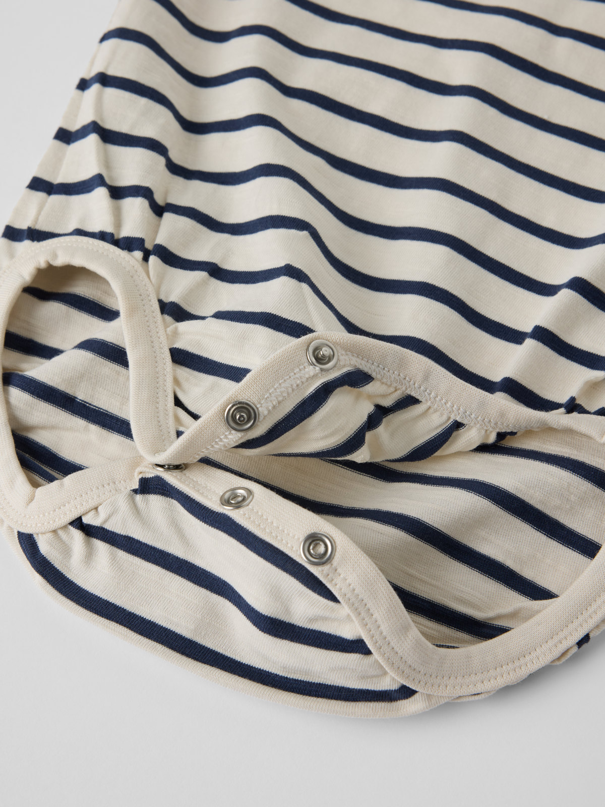 Sett med langermet body og shorts i 100 % tynn økologisk bomull til baby – perfekt på varme dager, gir lett beskyttelse mot solen og er sval og behagelig. Bodyen har trykknapper på begge skuldre og i skrittet for enklere klesskift. Shortsen har elastisk midje for god passform.