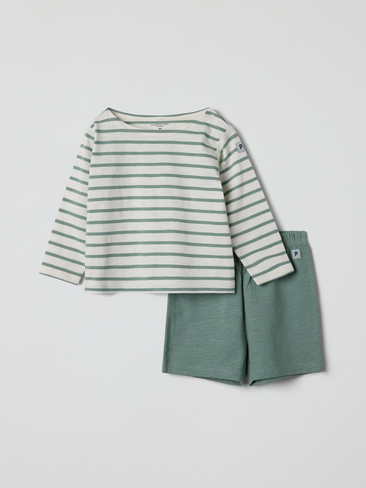 Sett med langermet body og shorts i 100 % tynn økologisk bomull til baby – perfekt på varme dager, siden det gir litt beskyttelse mot solen og er svalt og deilig. Bodyen har trykknapper på begge skuldrene og i skrittet for enkel av- og påkledning. Shortsen har elastisk midje for god passform.
