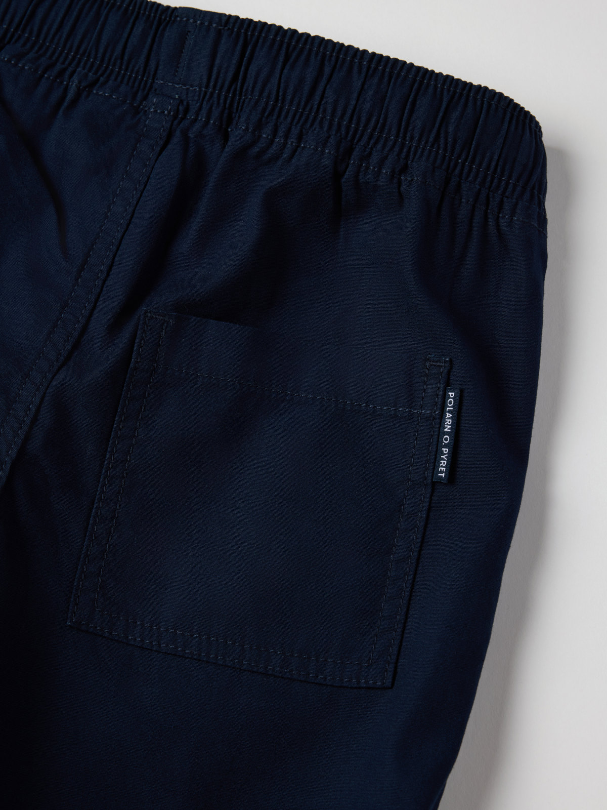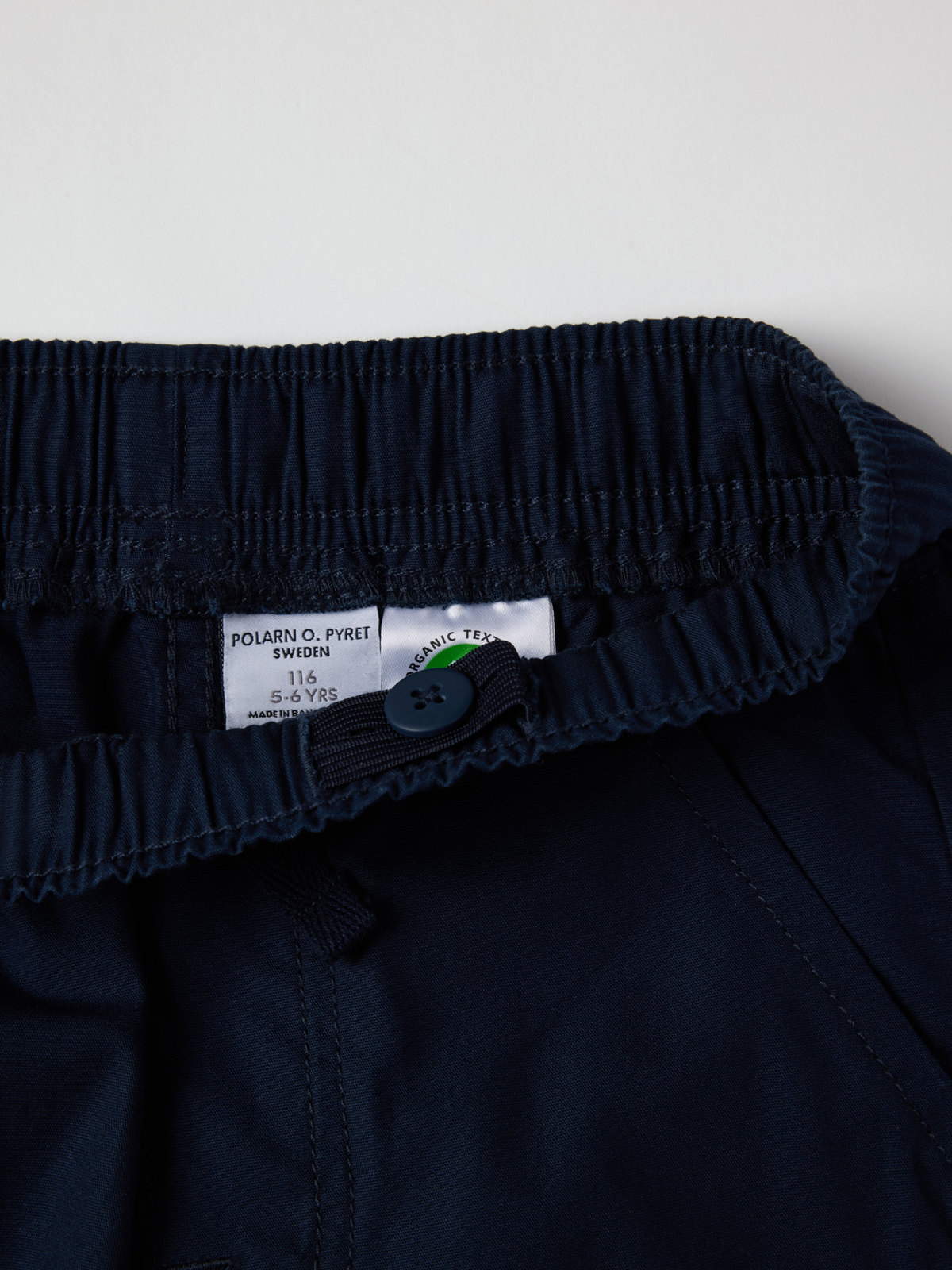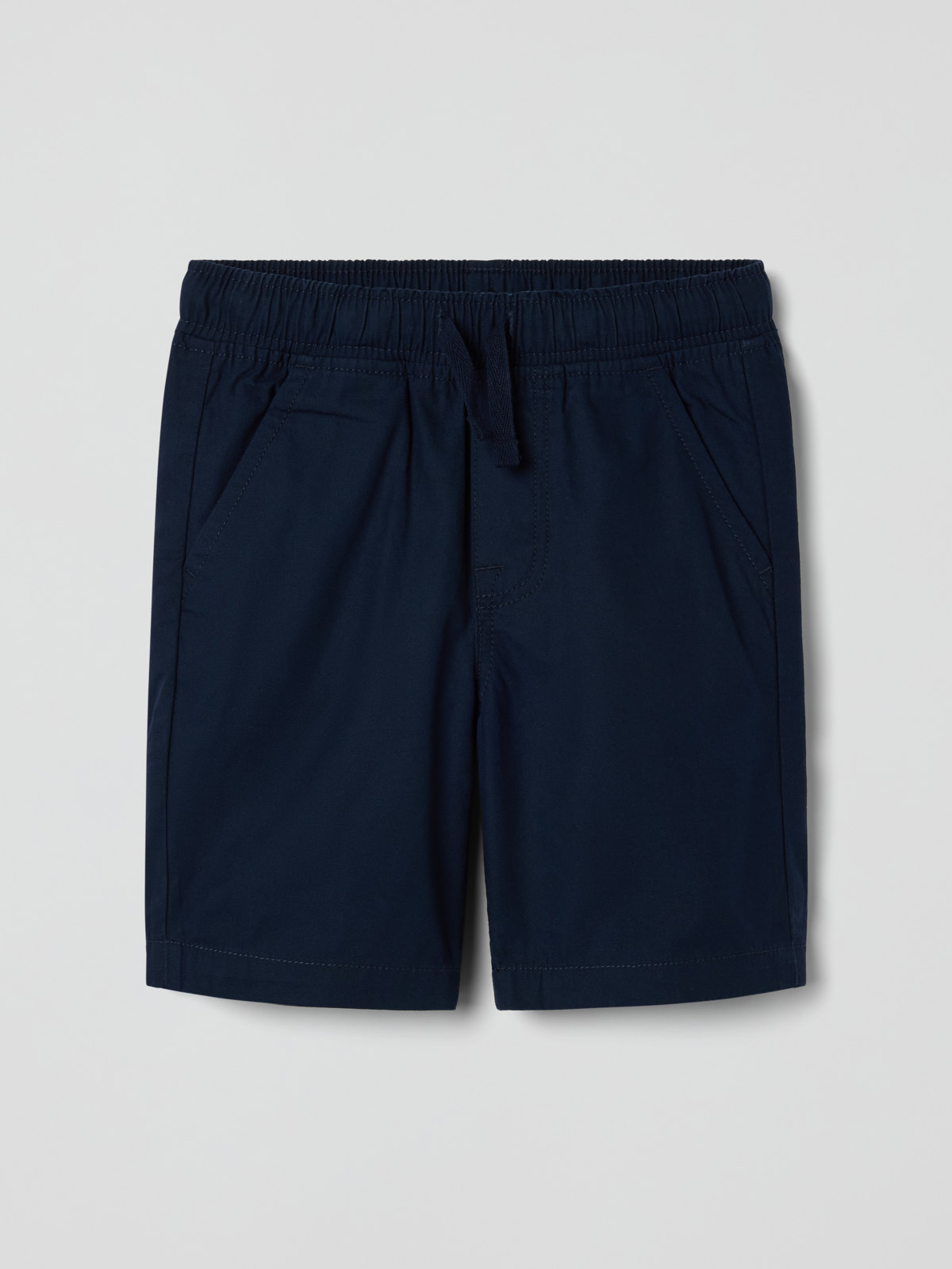 Ensfarget shorts i vevd økologisk bomull – tynn og behagelig til både hverdag og fest. Shortsen har elastisk midje som kan reguleres med knytebånd, og to lommer foran.