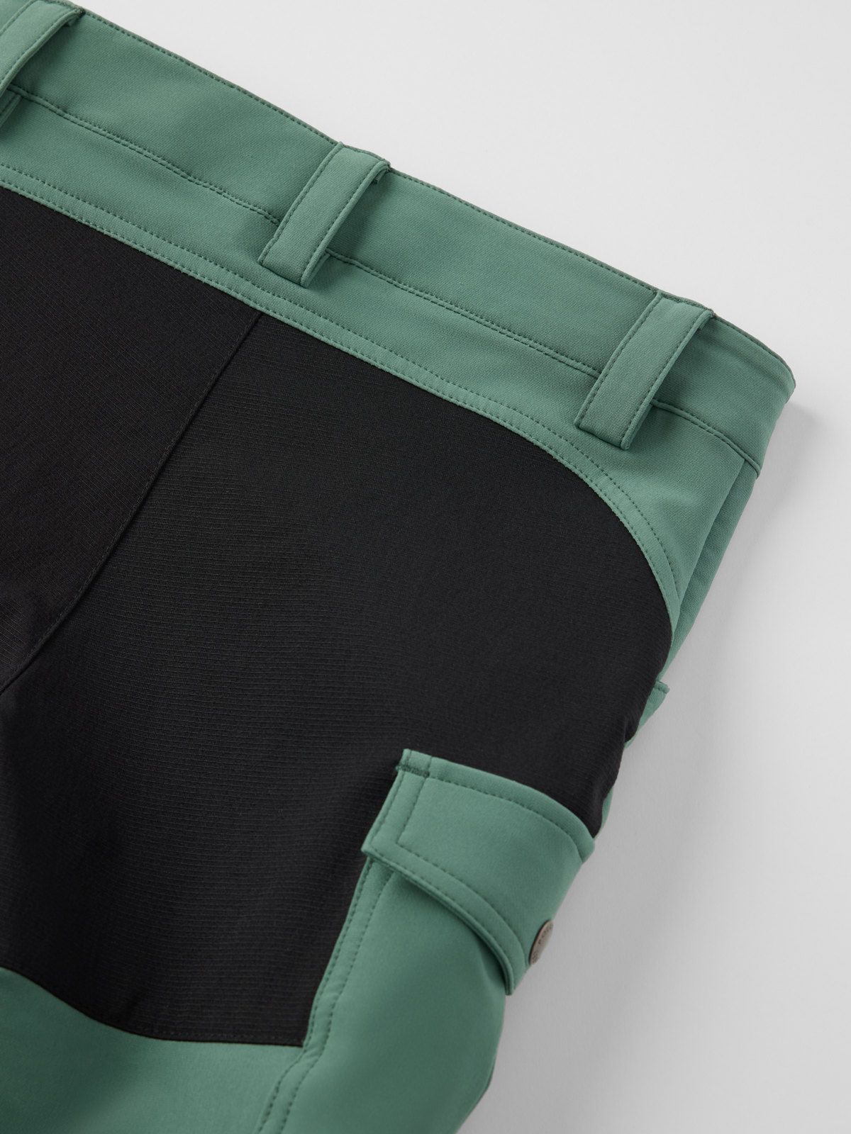 Shortsen har to frontlommer og en benlomme med trykknapp. Midjen har beltehemper og kan justeres på innsiden med knapphullsstrikk. Gylfen lukkes med trykknapp og glidelås.