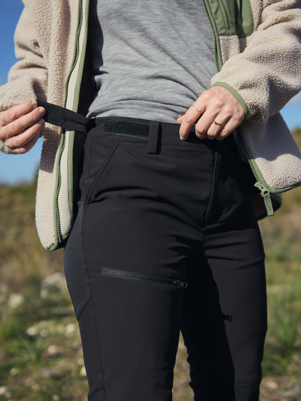 Benslutt og midje kan justeres med borrelås. I midjen finnes det også hemper til belte.