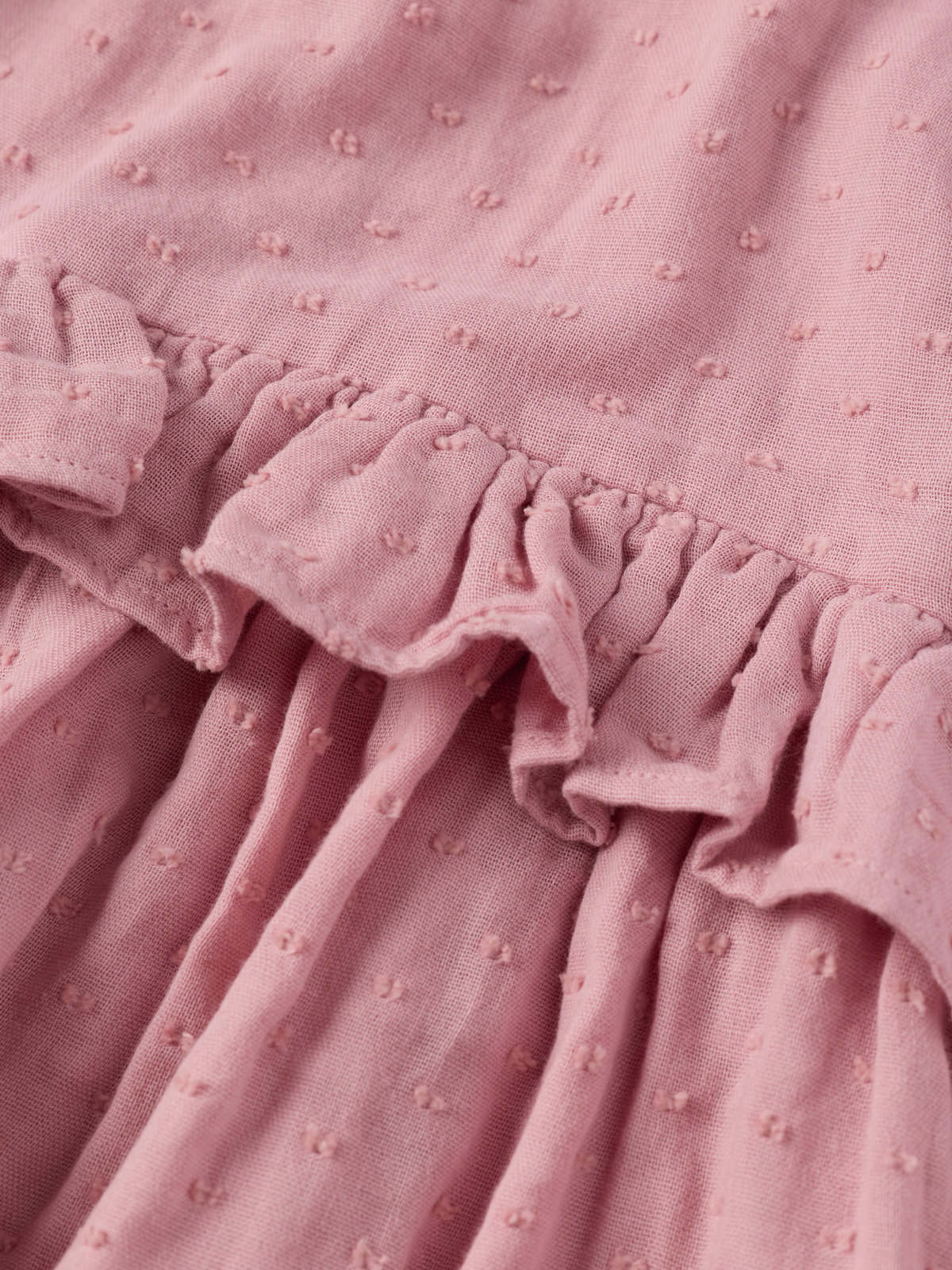 Søt musselinkjole i 100 % økologisk bomull til baby – perfekt for alle anledninger! Kjolen har volanger i midjen og over skuldrene, og lukkes med knappestolpe bak. Ermene har strikk i nederkant.