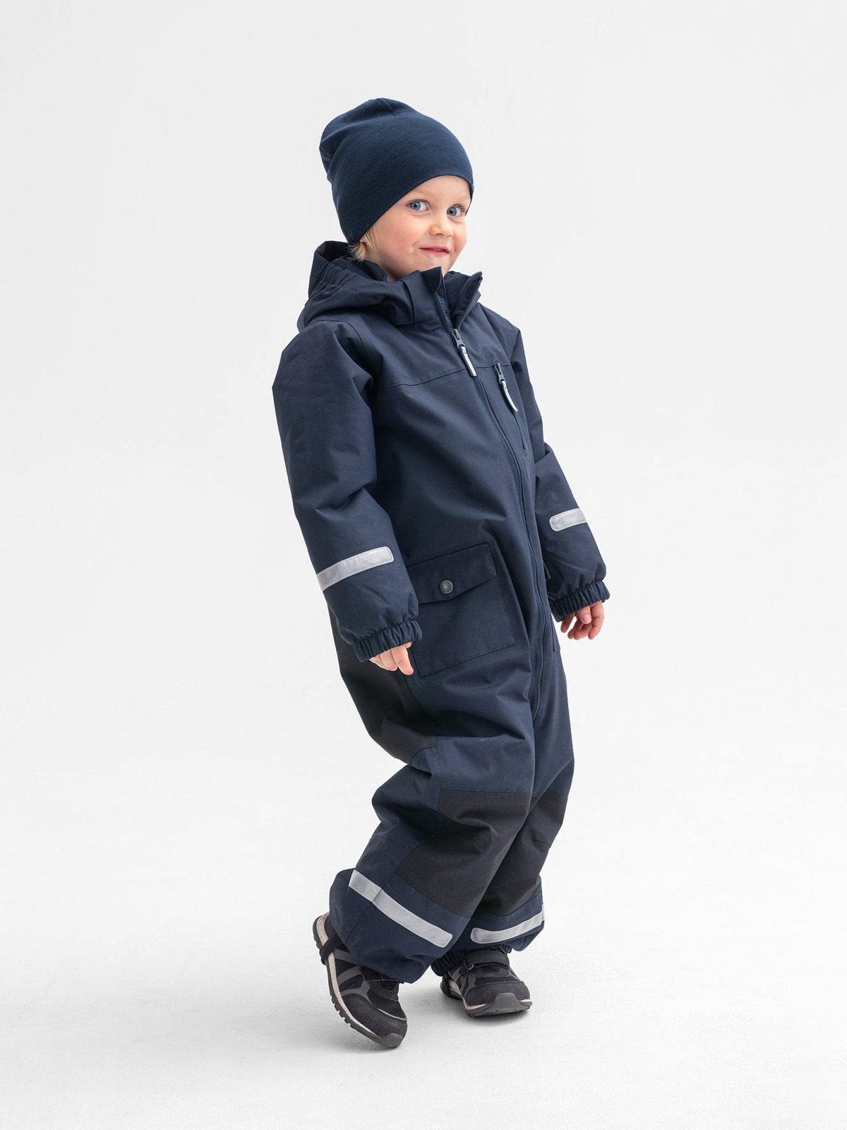 Det som gjør denne dressen ekstra spesiell, er at den har et avtakbart fôr i varm og deilig fleece, slik at den kan brukes både vår/høst og i mildere vintervær. Ved hjelp av en kontrastfarget startknapp på innsiden er det enkelt å kneppe fleecefôret sammen med dressen. Den regulerbare hetten er avtakbar og kan festes med trykknapper. Mykt fleecefôr på innsiden av kragen og nederst på ermene. Og vindklaffen på innsiden av glidelåsen gir ytterligere beskyttelse mot kald luft. Strikk i midjen, nederst på ermene og bena gir god passform. De utskiftbare fotstrikkene holder buksen på plass.