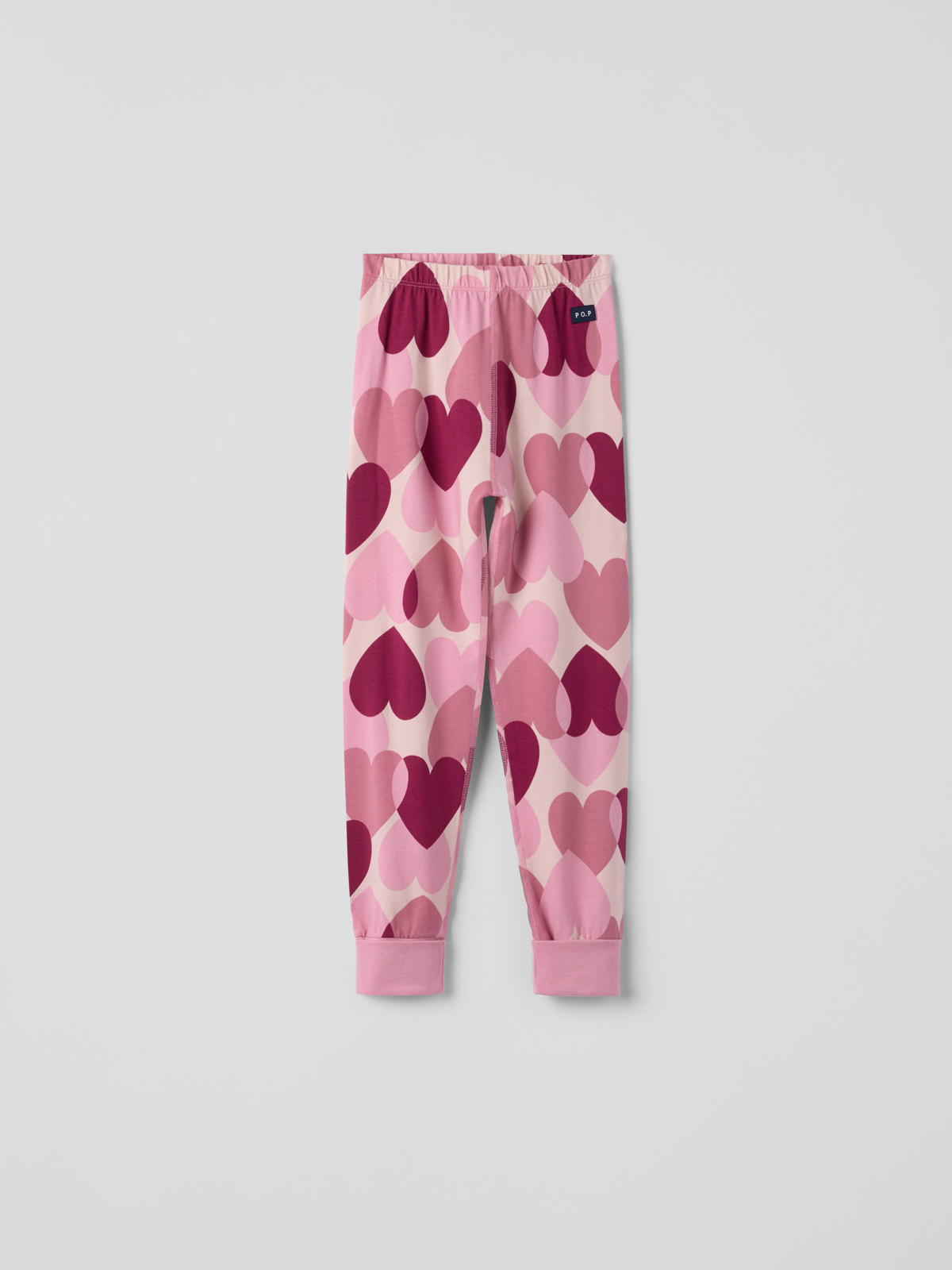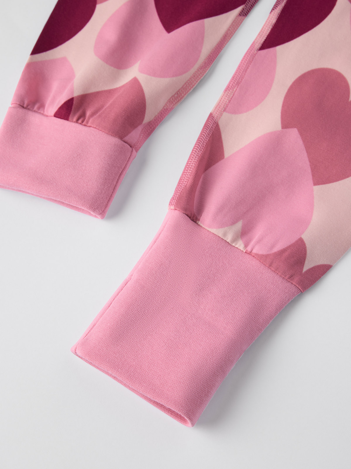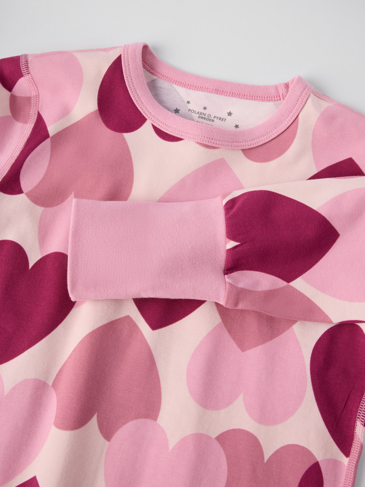 Todelt pyjamas i myk økologisk bomull. Overdelen har ekstra lang vrangbord nederst på ermene, som kan brettes opp eller ned. Buksen har elastisk midje og ekstra lang vrangbord nederst på bena.