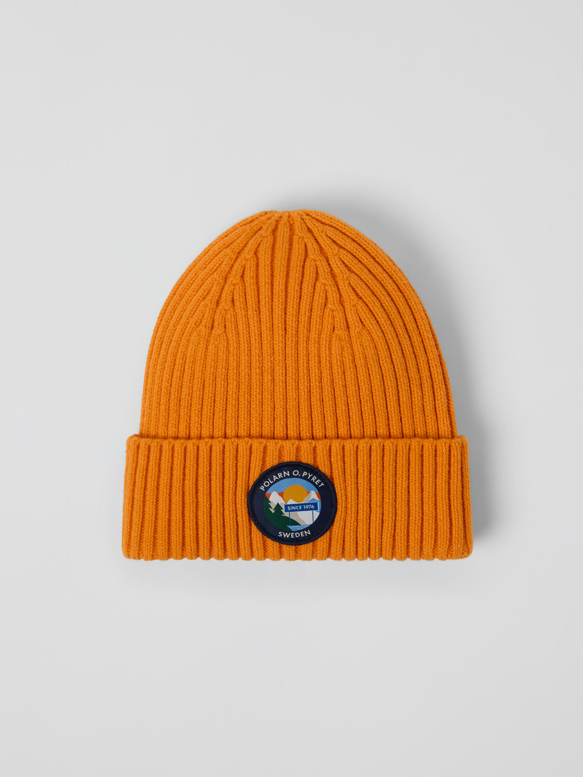 Ribbestrikket lue i varmende ullblanding. Luen har en myk oppbrett med en fin applikasjon foran.