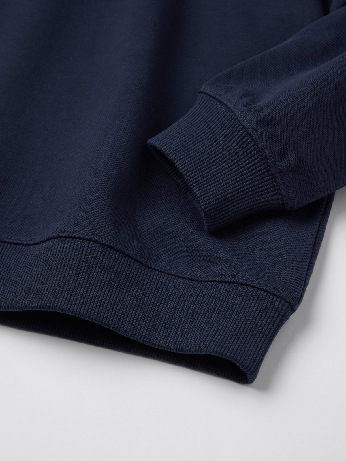 Genser i 100 % økologisk bomull med myk collegekvalitet. Et perfekt plagg for alle anledninger! Genseren har ribbestrikket vrangbord i halsutringningen og nederst på ermene.