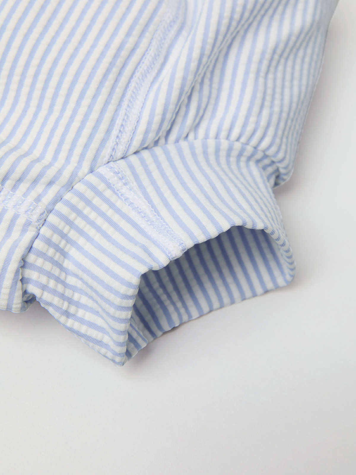 Stripet badebleie i myk og behagelig bækkebølge – perfekt til babysvømming eller badeturer! Badebleien har bred strikk i midjen og ved benåpningene for behagelig passform og for å fange opp små uhell.