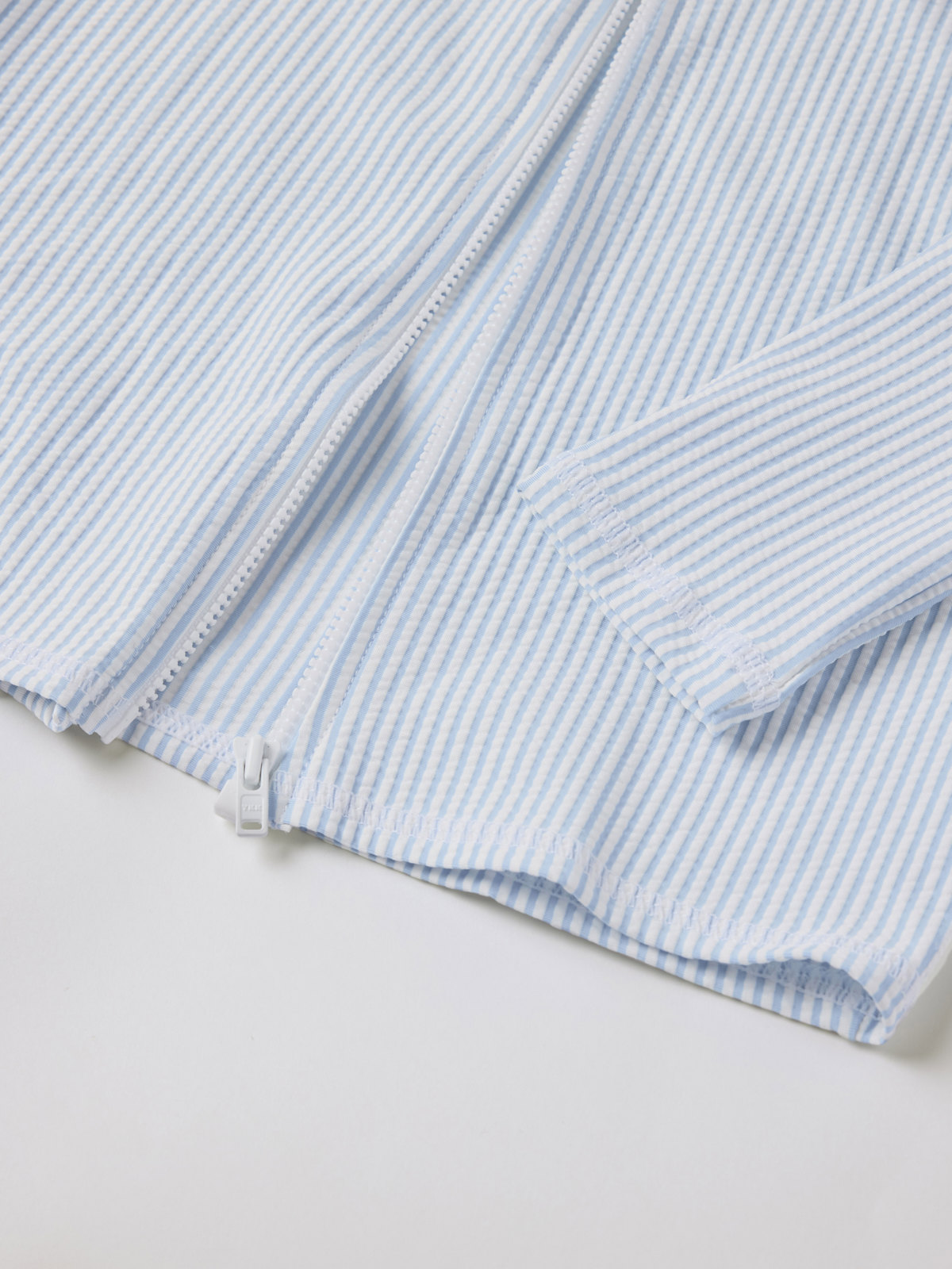 Langermet UV-topp med praktisk glidelås foran og UV-beskyttelse UPF 50, laget i myk og behagelig seersucker. Toppen har ekstra myke sømmer som ikke gnager mot huden.