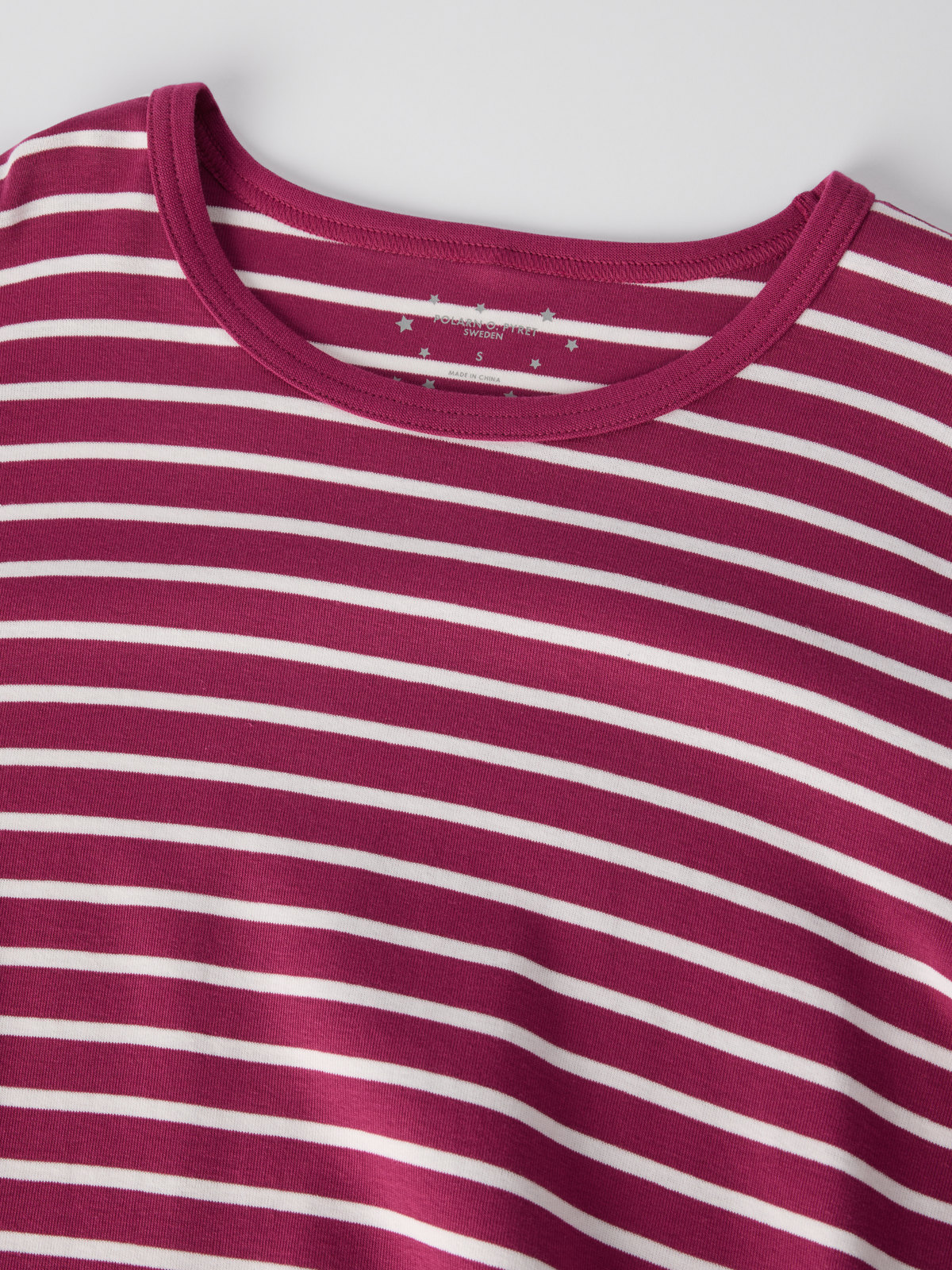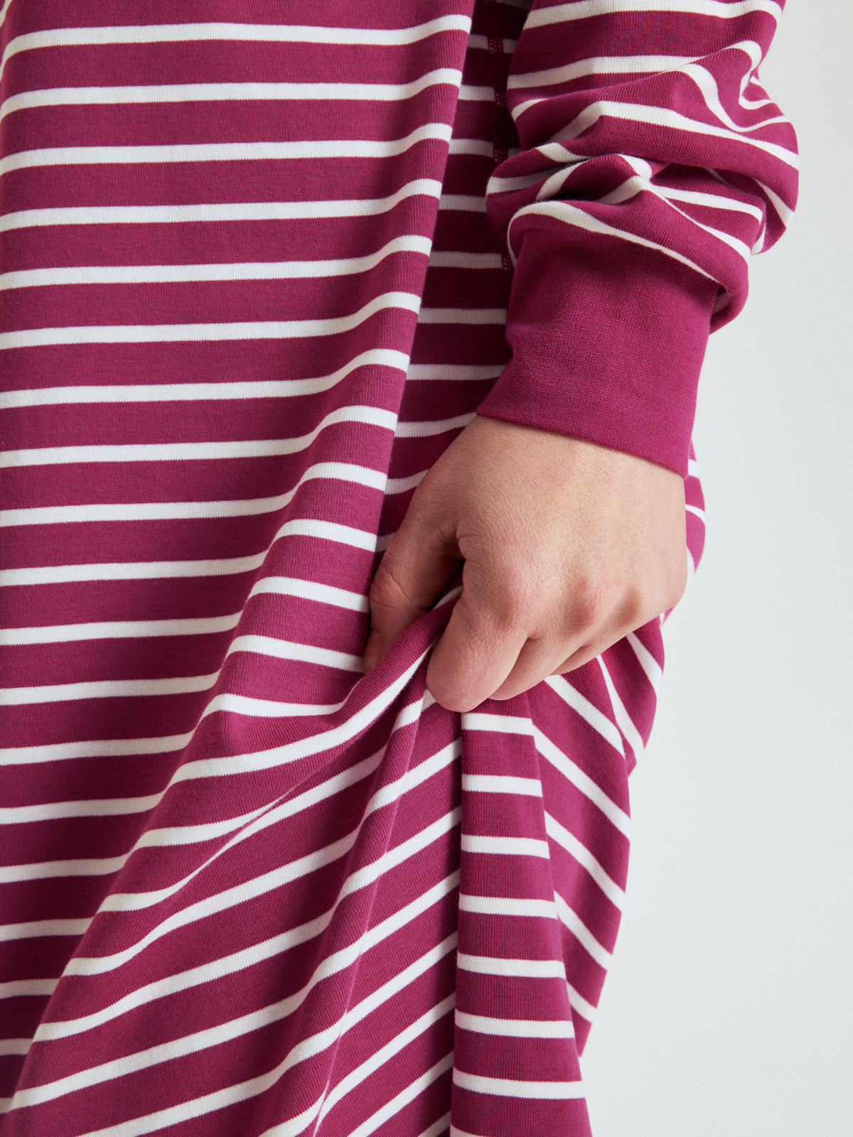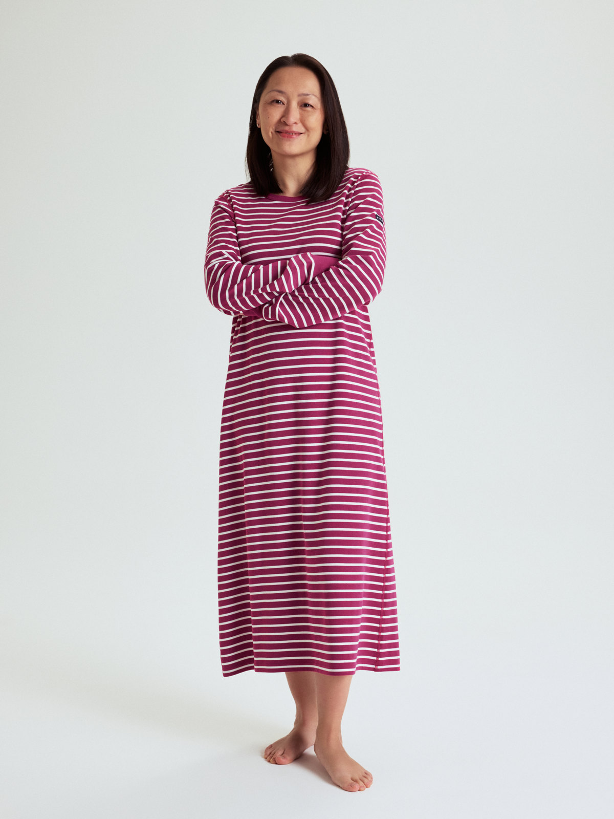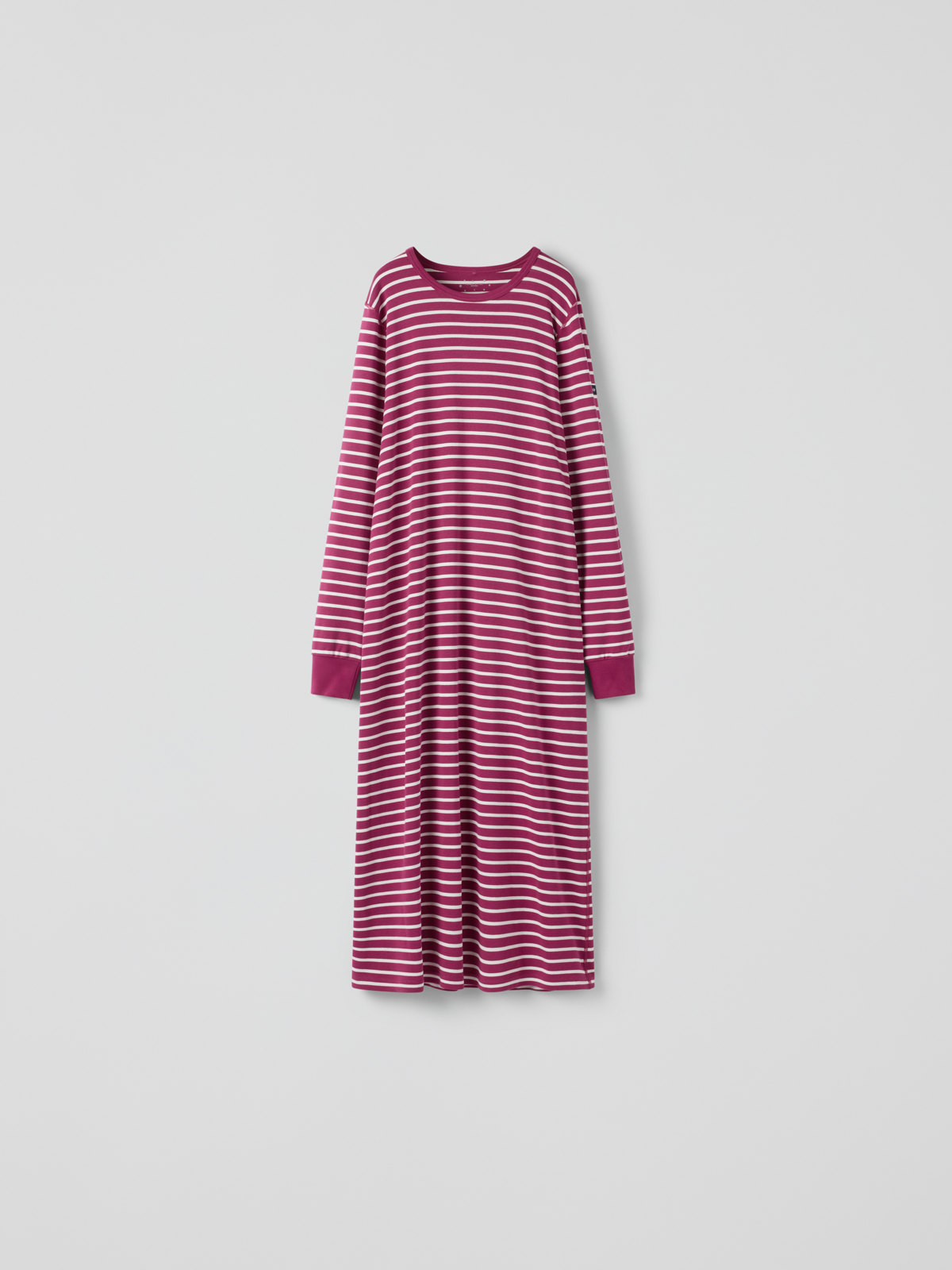 Myk og god nattkjole i 100 % økologisk bomull, i voksenstørrelser. Nattkjolen har våre klassiske striper og myk vrangbord nederst på ermene.