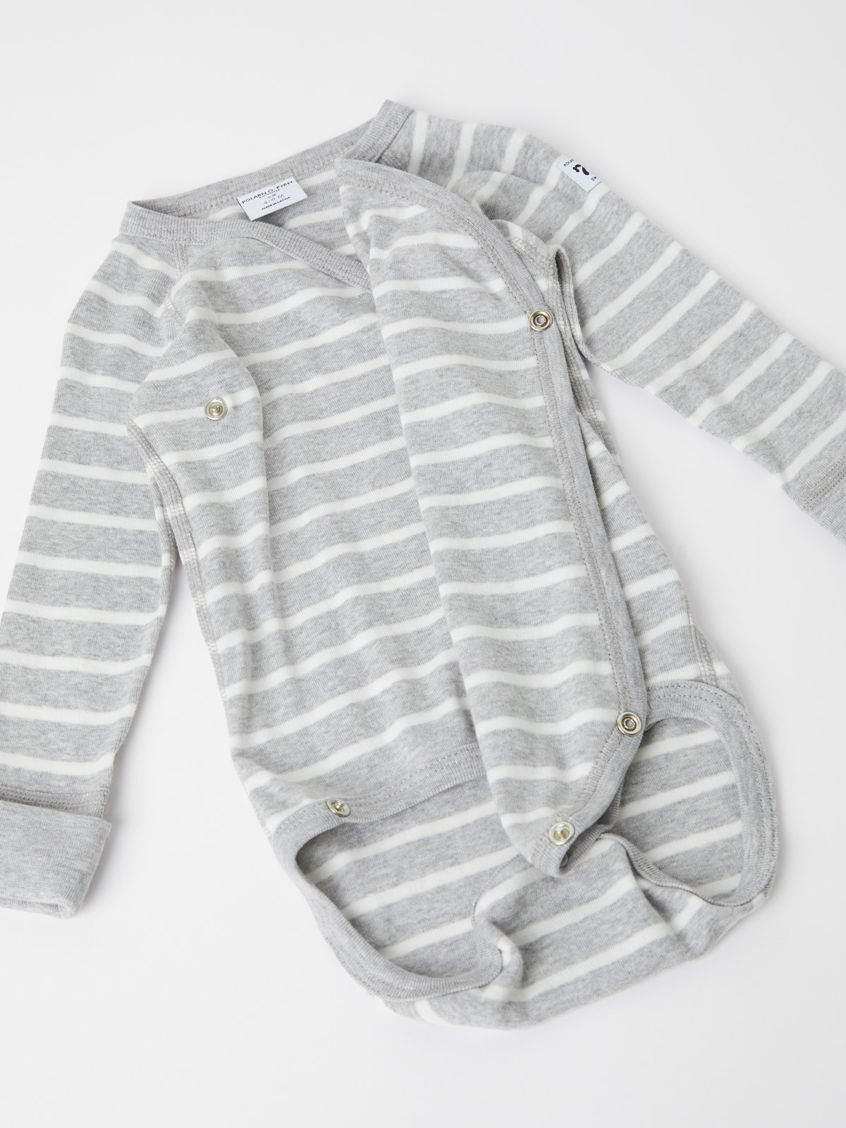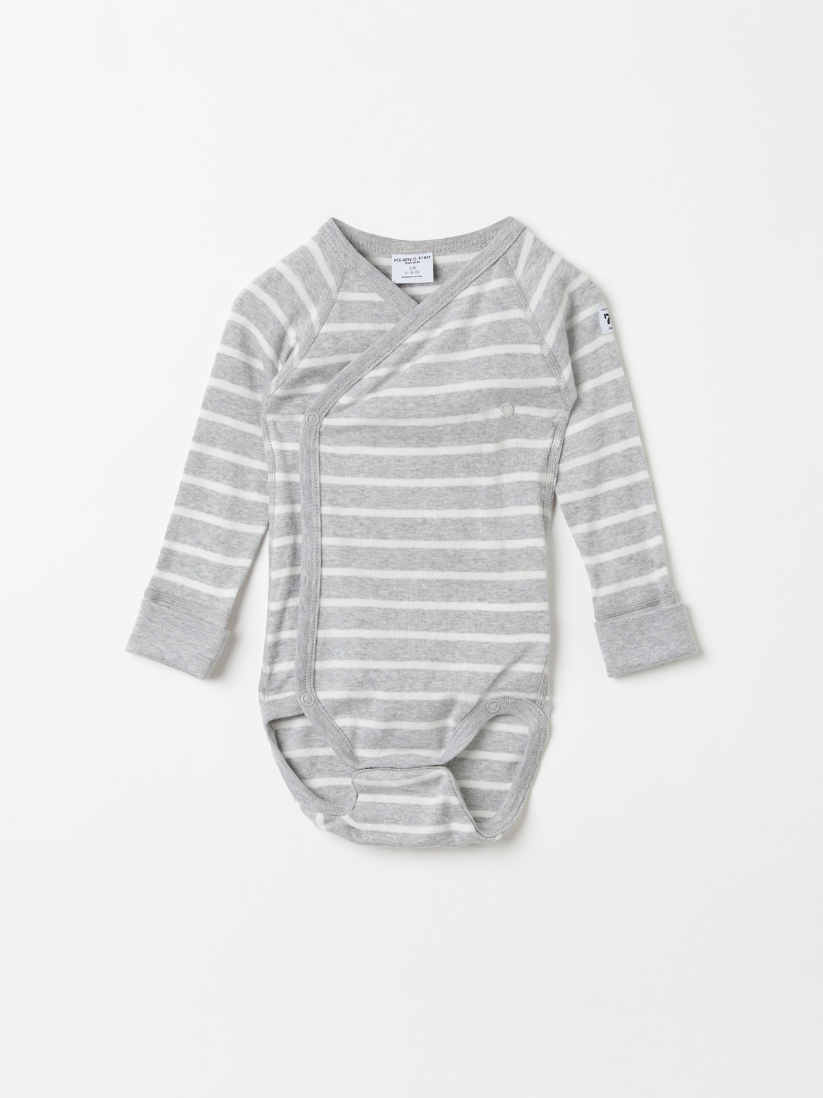 Omslagsbody i økologisk bomull til nyfødt. Bodyen har våre klassiske striper og myk, ribbestrikket vrangbord nederst på ermene, som kan brettes ned etter hvert som babyen vokser. Trykknappene langs omslagsåpningen og i skrittet gir enklere kles- og bleieskift.