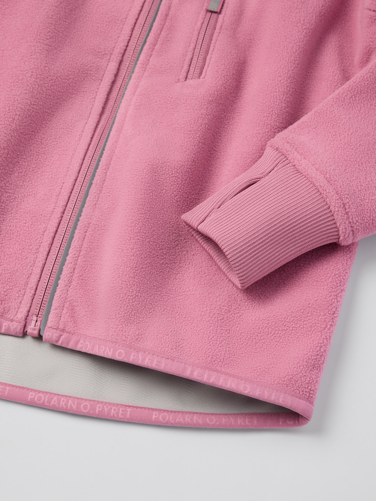 • Ribbestrikket vrangbord med tommelåpning nederst på ermene (størrelse 80–92 har ikke tommelhull)